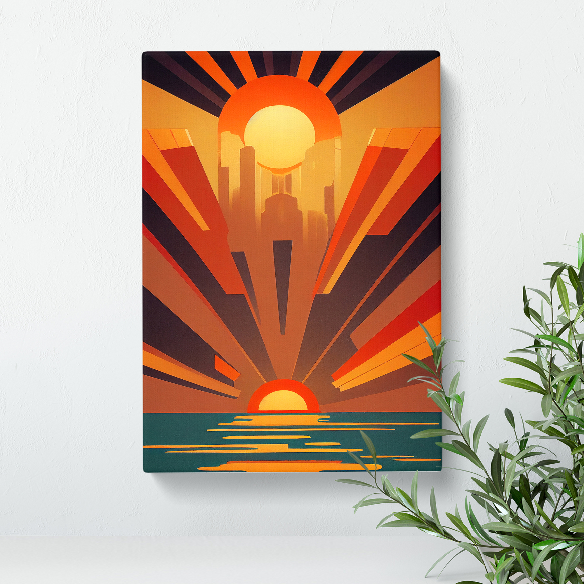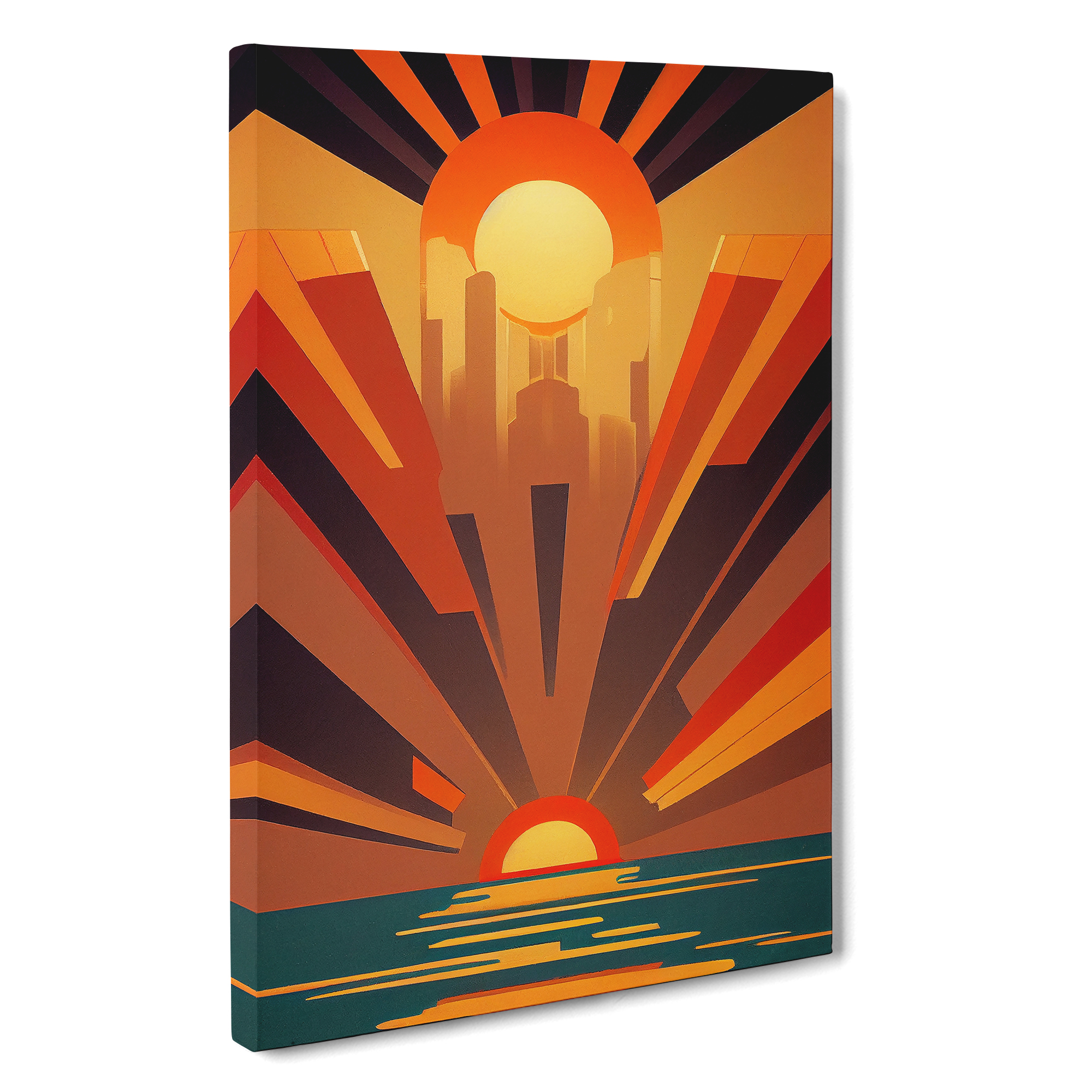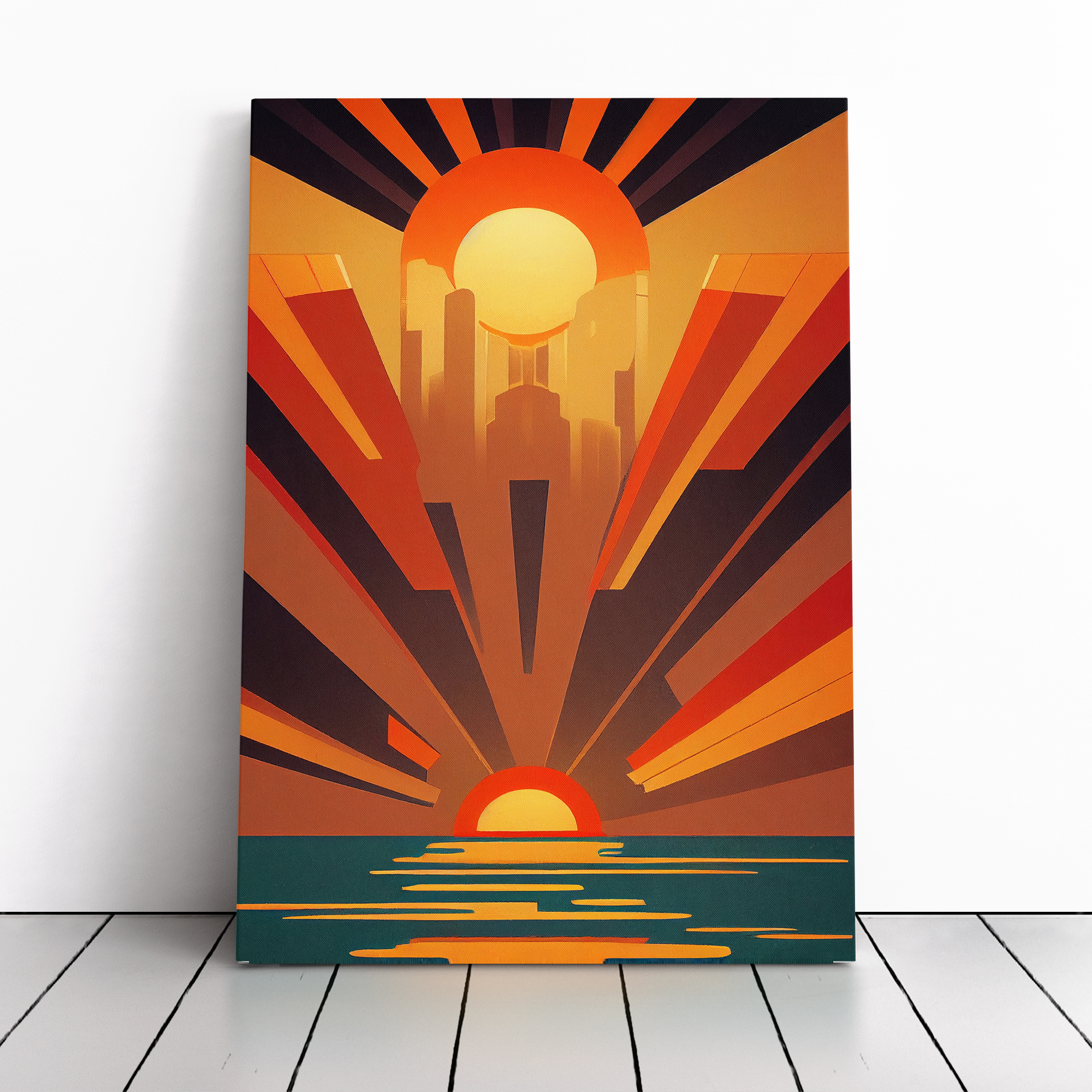 Transform your living space with our framed canvas wall art prints. Designed to elevate your home decor, this stunning picture titled Art Deco Ocean Sunset No.1 is crafted in the UK, and boasts a contemporary gallery wrapped finish. Utilising high-quality inks and materials, the colours of the wall art print are rich, vibrant, and true to life. The canvas is stretched over a 30mm deep frame creating a stylish wall art picture that is ready to hang in your living room, lounge, bedroom, dining room and home office.