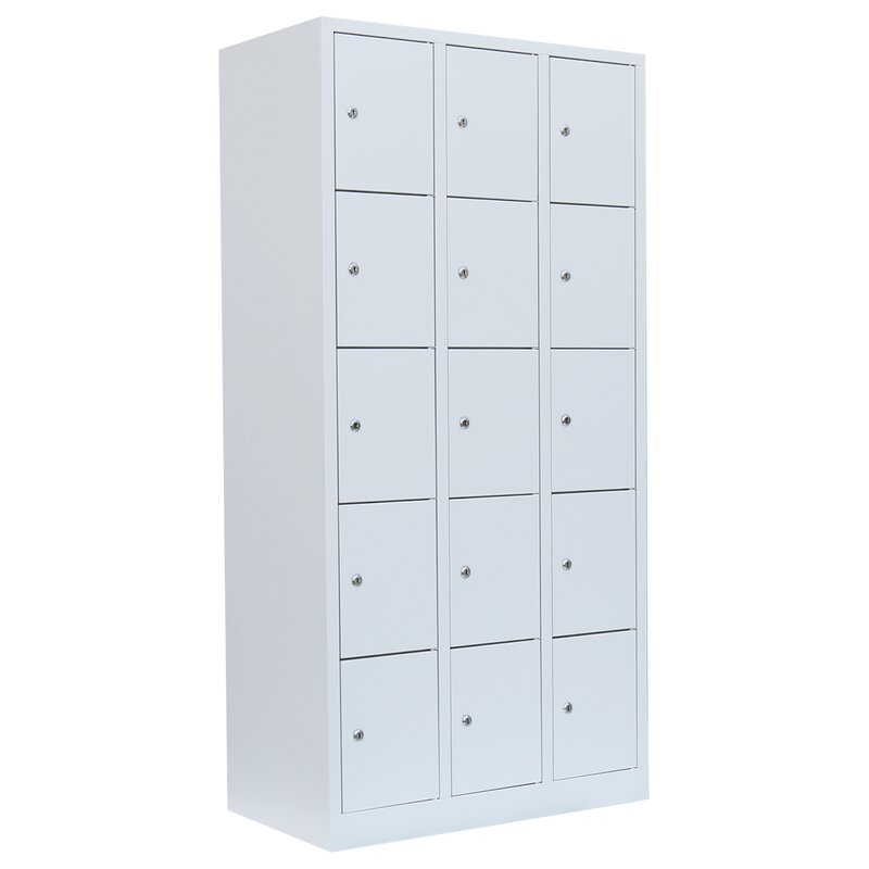Steelboxx Schließfachschrank, 3 Abteile, gesamt 15 Fächer mit Sicherheits-Zylinderschloss inkl. 2 Schlüssel pro Fach, Abteilbreite: 300 mm, Material: Stahl, Maße: H 1800 x B 900 x T 500 mm, komplett montiert und verschweißt kein Aufbau notwendig, Farbe: verschiedene Farben wählbar.