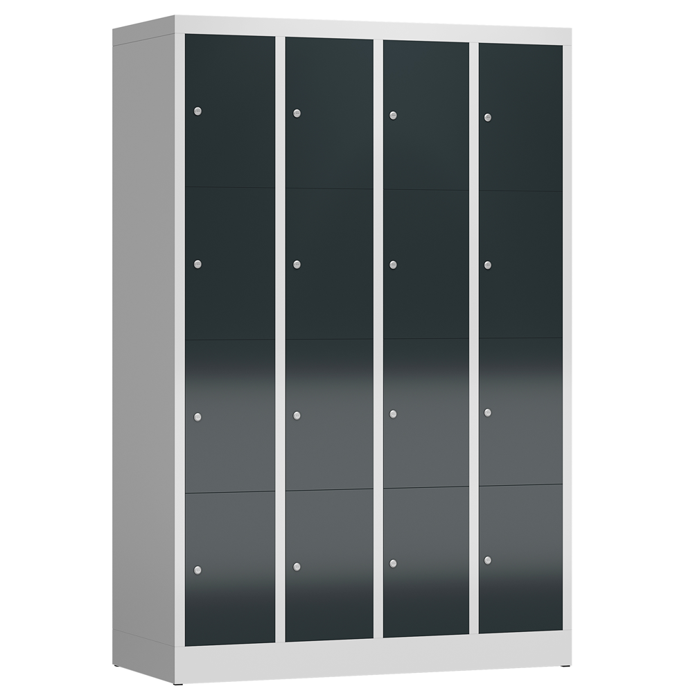 Profi-Schließfachschrank/Fächerschrank mit 4 Abteilen, 16 Fächern, Abteilbreite/ Fachbreite ca. 300 mm, universell einsetzbar, für Umkleideräume, Sozialräume und Pausenräume jeder Branche - in Industrie und Handwerk, in KFZ- Werkstätten, im Einzelhandel, in Wohnheimen, Fitnessstudios, Turnhallen, Betrieben, Schulen, Sportstudios, Lager- und Logistikbetrieben.