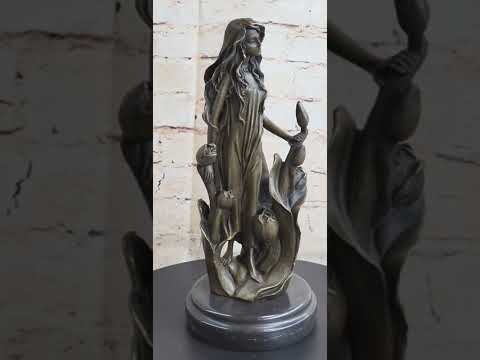 Experience the mesmerizing beauty of this bronze sculpture featuring a captivating woman amidst a lush flower garden. Her alluring presence is enhanced by a long and elegant dress that gracefully reveals her legs. With a gentle bow adorning her hair, she gazes towards her right, attentively searching for more flowers to pick. Balanced gracefully on a rock, she exudes a sense of tranquility and poise.
