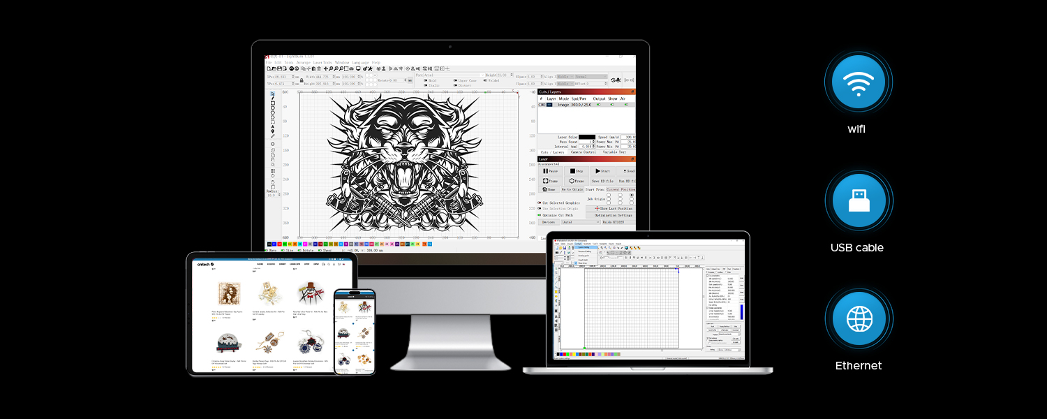Upload your designs directly to the machine through Wi-Fi or Ethernet & USB ports. Experience a seamless workflow whether you're using a PC, iPad, or mobile device.