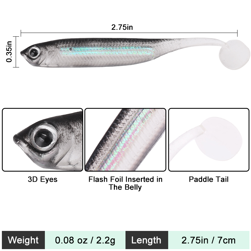 2. Realistic Details: This shad soft plastic lure with ultra realistic details, target fishes won't be able to ignore it. The shad lure include highly detailed fish scale pattern, fish gills plate, and ultra realistic 3D eyes. With flash foil in the belly to provide reflection under the water which is good on the days when you need that flash, thus will more attract bites.