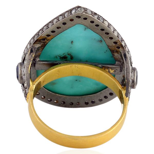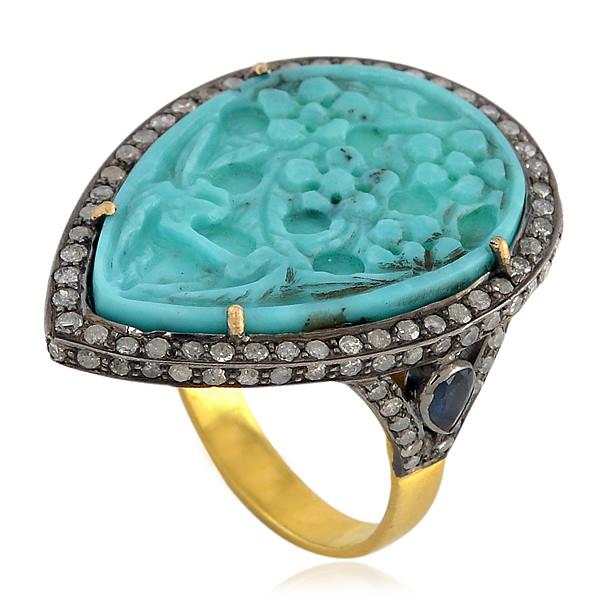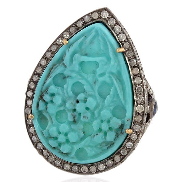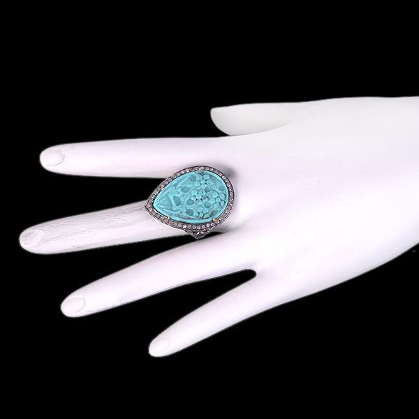 6.55ct Carved Turquoise Diamond Pear Shape Vintage Look Ring 925 starling Silver
