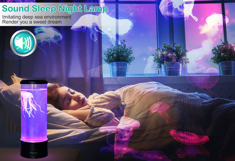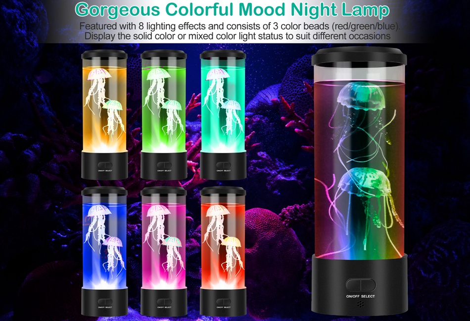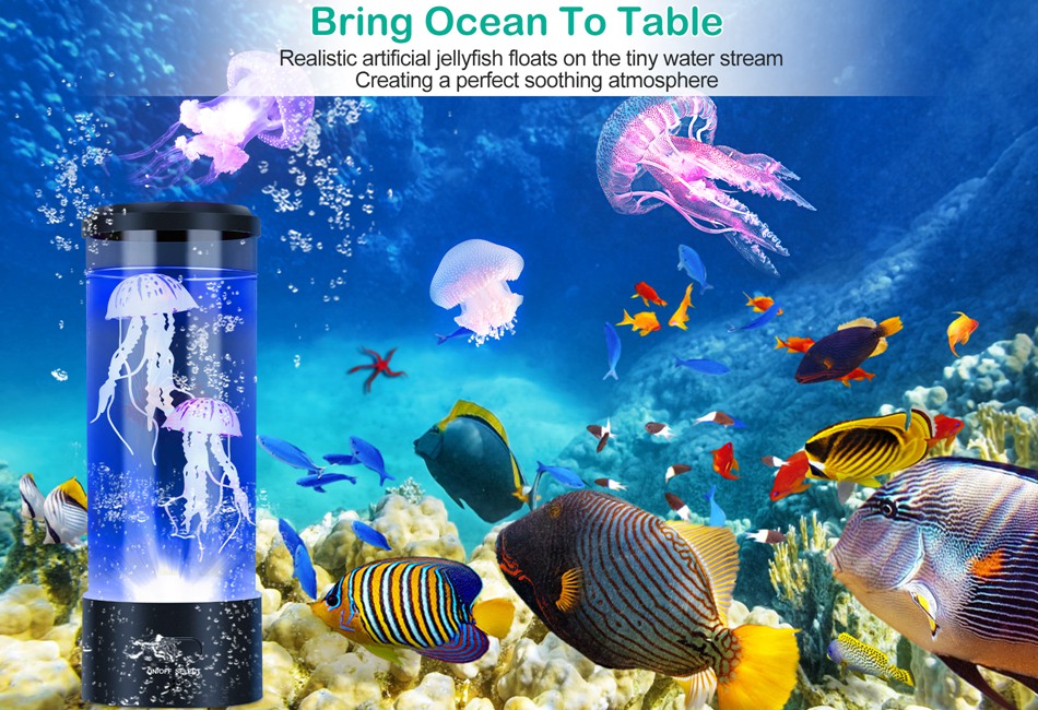 FAST SHIPPING & GOOD QUALITY Product Detail Image GalleryProduct DescriptionOverview:Our jellyfish lava lamp creates a wonderful and atmosphere that helps children arouse their curiosity, imagination and creativity. It also helps kids overcome the dark to fall asleep. Also Perfects for indoor decoration as a romantic mood light and bedside lamp. Choose to display the solid color or mixed color light status to suit different occasions. Jellyfish adopts premium silicone materials, your kid can have his or her pet and no need to worry about feeding it or maintaining it. Low noise pump ensures our jellyfish lamp are quiet, it will not disturb family even at night. Also a great decoration for your home. Features:- *Bring Ocean To The Table:Realistic artificial jellyfish float on the tiny water stream generated by the motor in the lamp,creating a perfect soothing atmosphere,realistic and peaceful movement,you will question whether they are real.