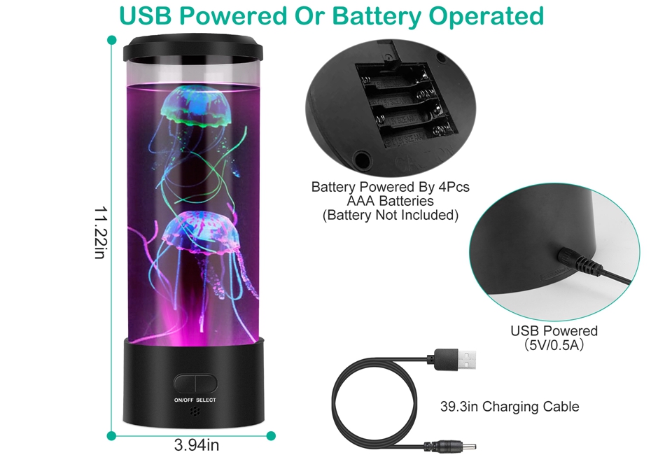 - *Dual Power Supply Methods:Come with charging cable,you can charge the mood lamp through PC USB output port,power bank or powered by 4Pcs AAA batteries(Not included). If you need an interesting work and life partner,then the led jellyfish lava lamp is your best choice.