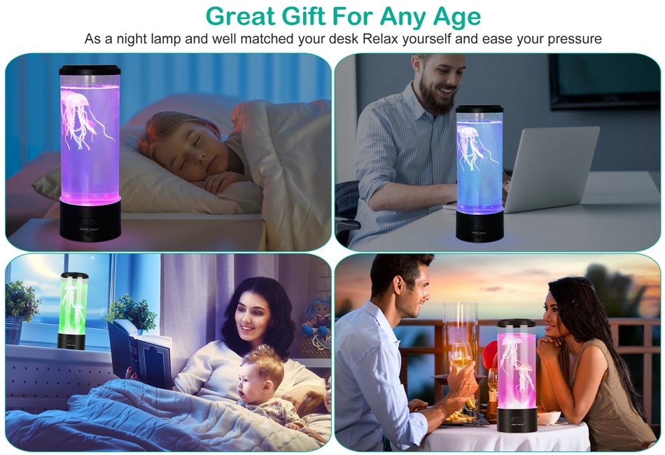 - *Great Relaxation Mood Lamp:Slow change of colors and slow floating jellyfishes are soothing and visually,create a soothing and relaxing environment,which helps clam you down. Realistic jellyfish lamp can be used for night light for kids and adults also,help you to fall asleep. It can be a perfect gift for boys,children,girls or anyone who likes to enjoy the beautiful scenery of the ocean,underwater creatures and marine environment on the desk.