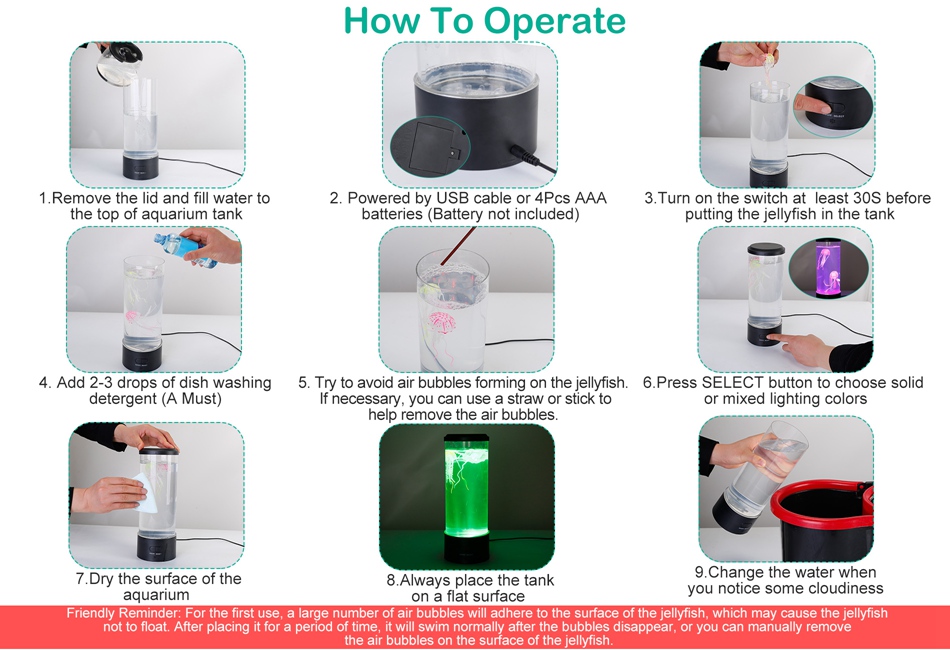 Friendly Reminder: How to use the jellyfish lamp correctly: a. If you don't add 2-3 drops of dishwashing liquid to the water,the jellyfish will not swim. b. If the jellyfish attaches to the blister,the jellyfish will not swim and the blister needs to be removed. c. Turn on the switch at least 30S before putting the jellyfish after fill the water into the aquarium. Specifications: Brand: iMounTEK Product Type: Jellyfish Lava Lamp Power: 2.5W Materials: PVC, Silicone Jellyfish LED Beads: 11Pcs Powered By: Included Charging Cable/4Pcs AAA Batteries (Not Included) Input: 5V/500Mah Color Selections: Red Light→Green Light→Blue Light→Red+Green Light →Red +Blue Light→Green+Blue Light→Red+Green+Blue Light→7 Color Gradient Light Charging Cable Length: 100cm/39.3in Jellyfish Size: 3.5x3.5x8.2cm/1.38x1.38x3.23in Jellyfish Weight: 3g/0.1OZ Item Size: 10x10x28.5cm/3.94x3.94x11.22in Item Weight: 366g/0.81lbs Package Size: 32*12.5*12.5cm/12.6*4.9*4.9in Package Weight: 520g/1.15lbs Package Contents: 1x Decorative Jellyfish Lava Lamp 2x Lifelike Jellyfish 1x Charging Cable 1x User Manual Terms & ConditionsThank you for your business ! |