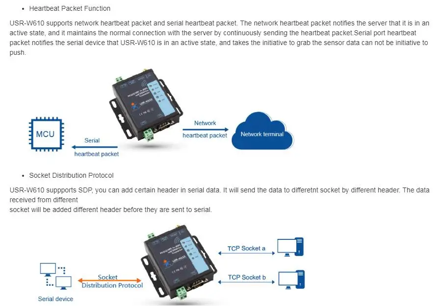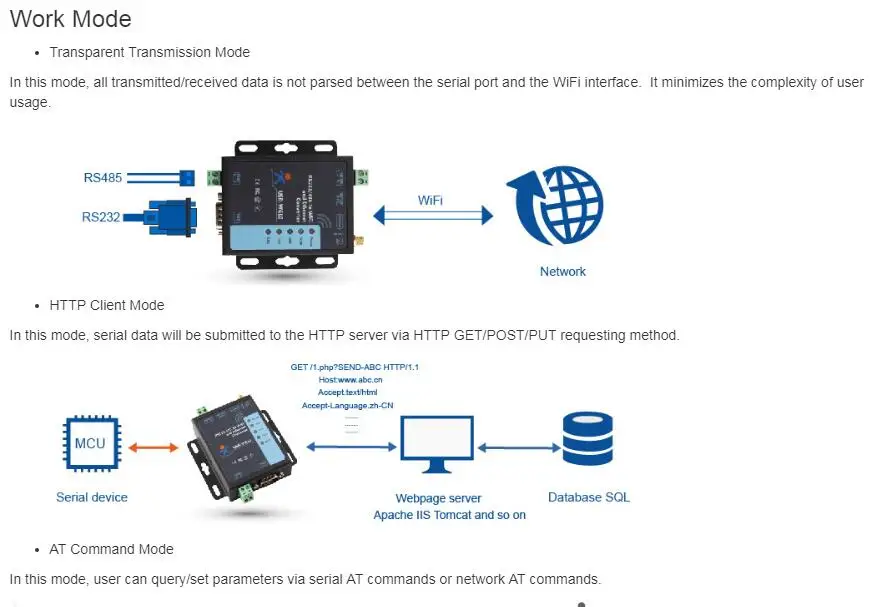 Support TCP Server/TCP Client/UDP Server/UDP Client/HTTP Client mode.
