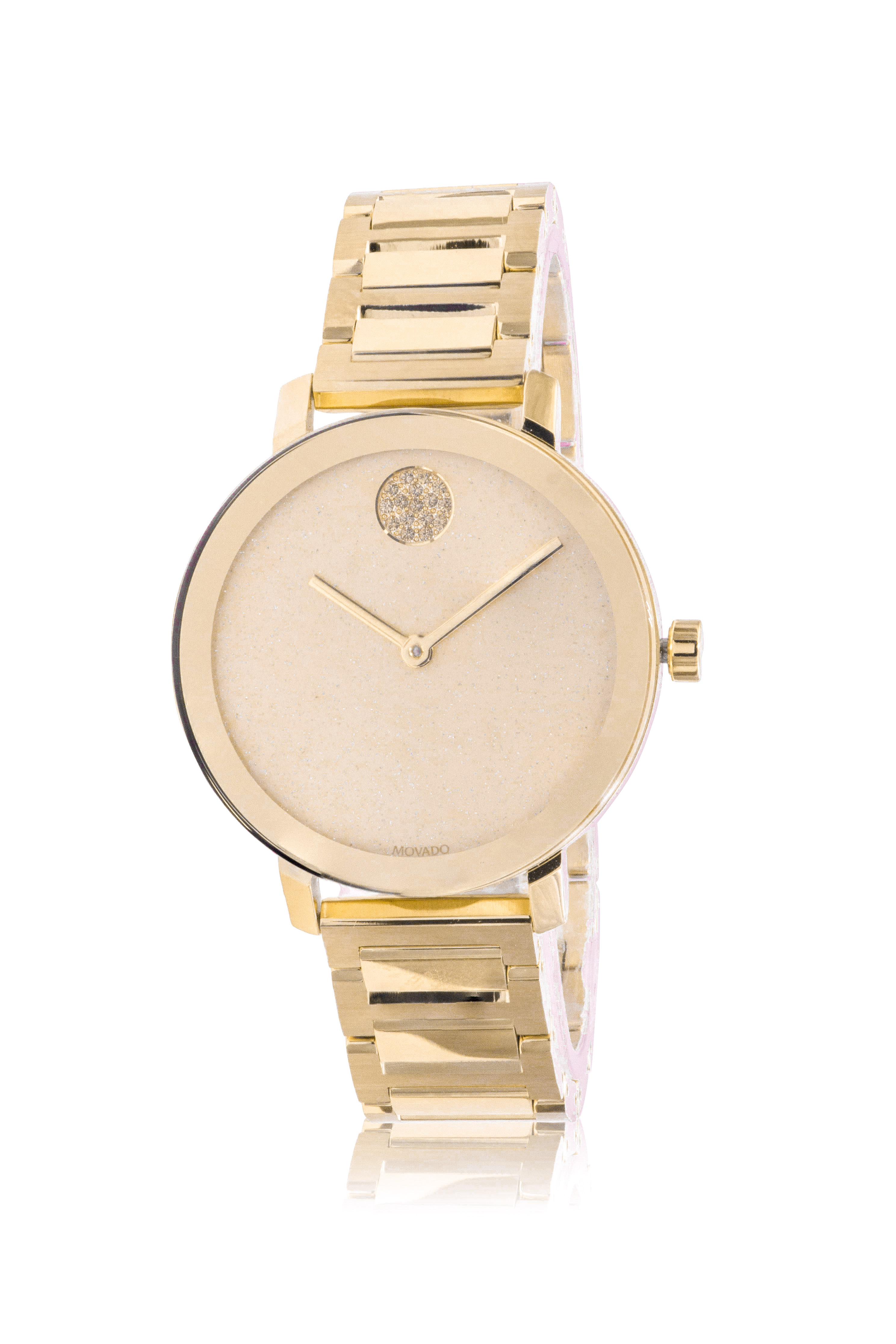 Pale gold ionic-plated stainless steel case and bracelet.Gold metallic museum dial.Swiss quartz movement.K1 Mineral Crystal.Flat Crystal Pave Dot Finish.Water resistant 30 meters.Case 34mm.