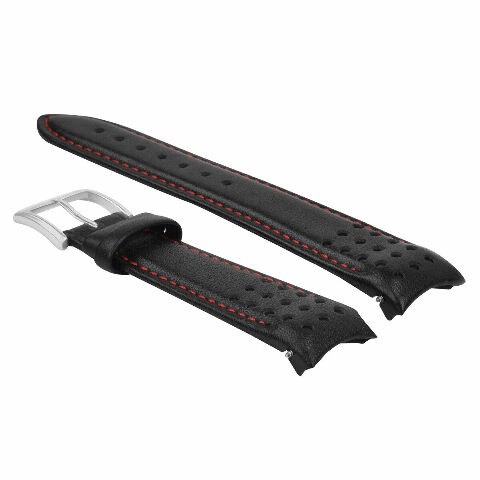 This strap is made of real leather with red thread stitching and 5mm padding for comfort and a classic look. It tapers from 21mm at the lugs to 18mm at the buckle.