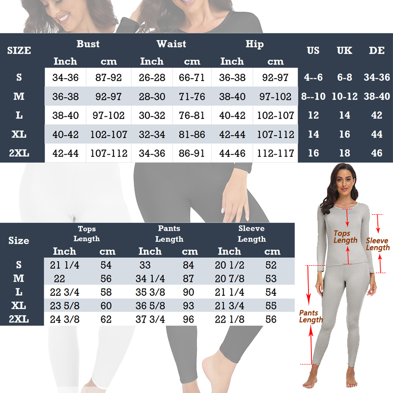 Women long johns thermal set are snug fit enough that there is no bulk showing when worn under clothes-even underneath jeans without disrupting your style.