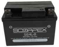 SCORPEX bietet mit der AGM Batterie SLA SB4L-B ein Modell mit 5Ah an, welche in 90% der Roller passend ist. Die Batterie ist ab Werk gefüllt und geladen. Die Blei-Säure Batterie ist auslaufsicher und wartungsfrei und kann in bis zu 90° geneigter Position eingebaut werden, wodurch diese bei sehr vielen unterschiedlichen Modellen passend ist. Die SLA SB4L-B ist ein echter Allrounder und hat auch keinerlei Probleme mit einem Kurzstreckenbetrieb. Die Batterie liefert eine ausgezeichnete Leistung und ist resistent gegen Erschütterungen.