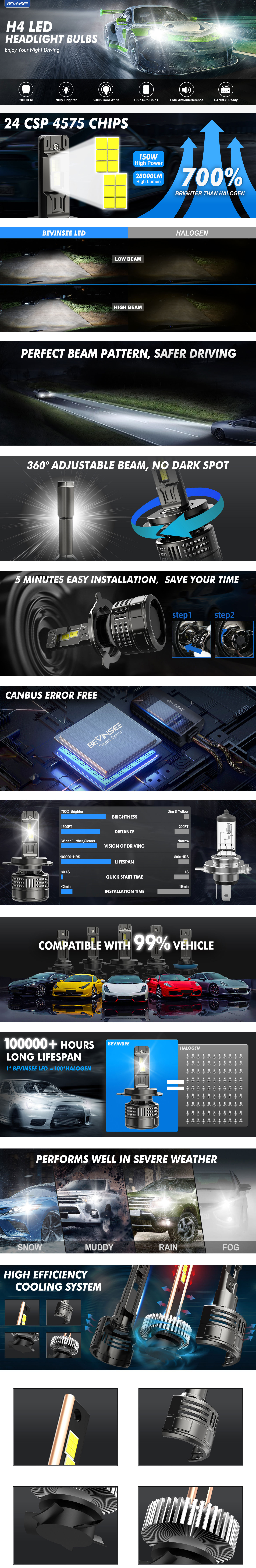 【Ultra-bright & focused LED Beads】150W/Pair, 28,000 LM. A total of 12 CSP 4575 LED beads on both sides. Steadily output high luminous flux, focused light with stronger penetration. You don’t have to worry about driving at dark nights or in any bad weather conditions.