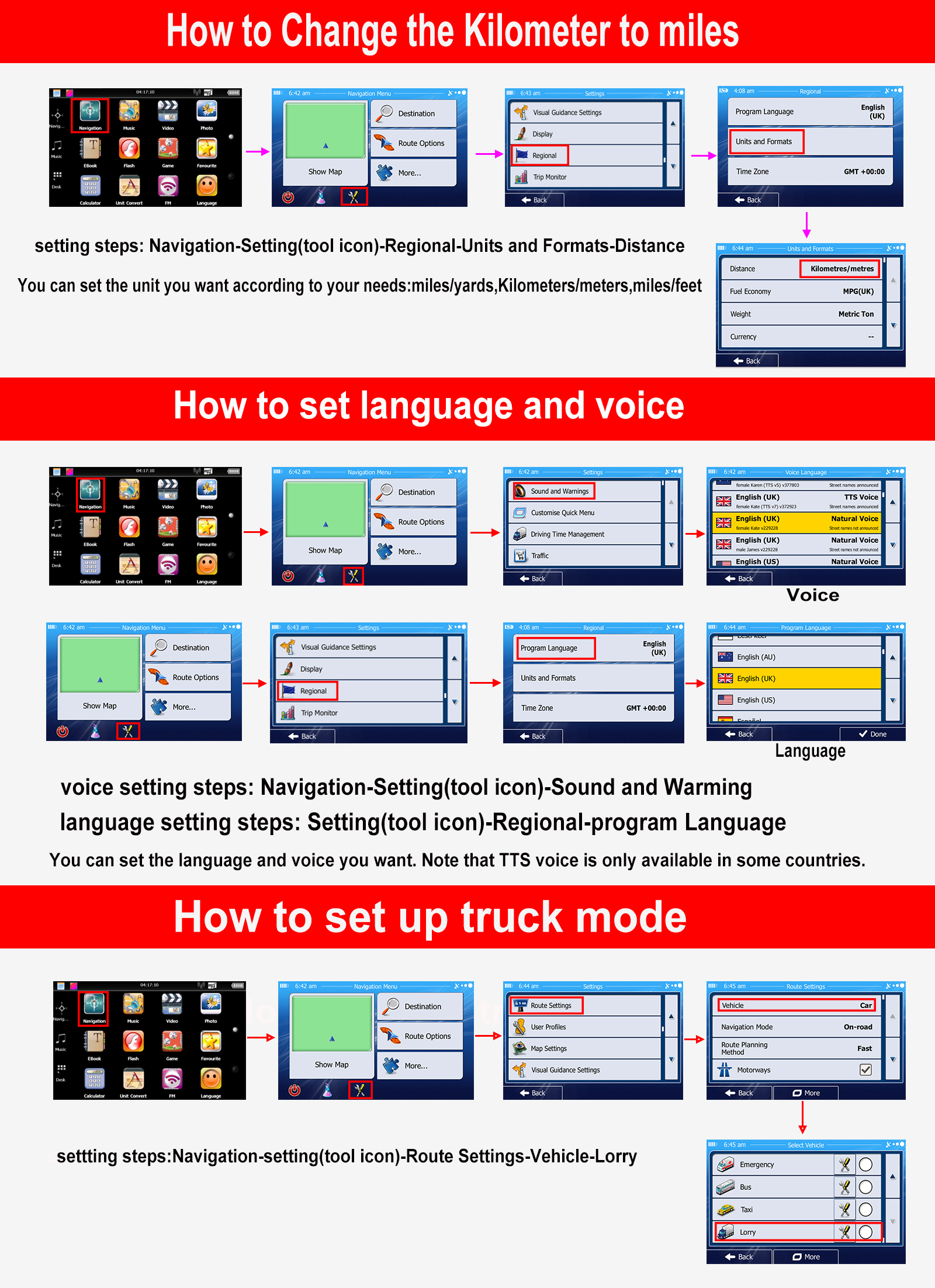 Special function for truck: After setting your truck profile, it will customize personalized route according to the height length and weight of the truck, intelligently avoid the risk routes which may have route limit, speed limit, height limit, width limit, weight limit etc.