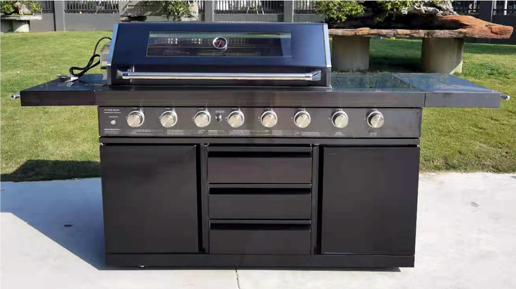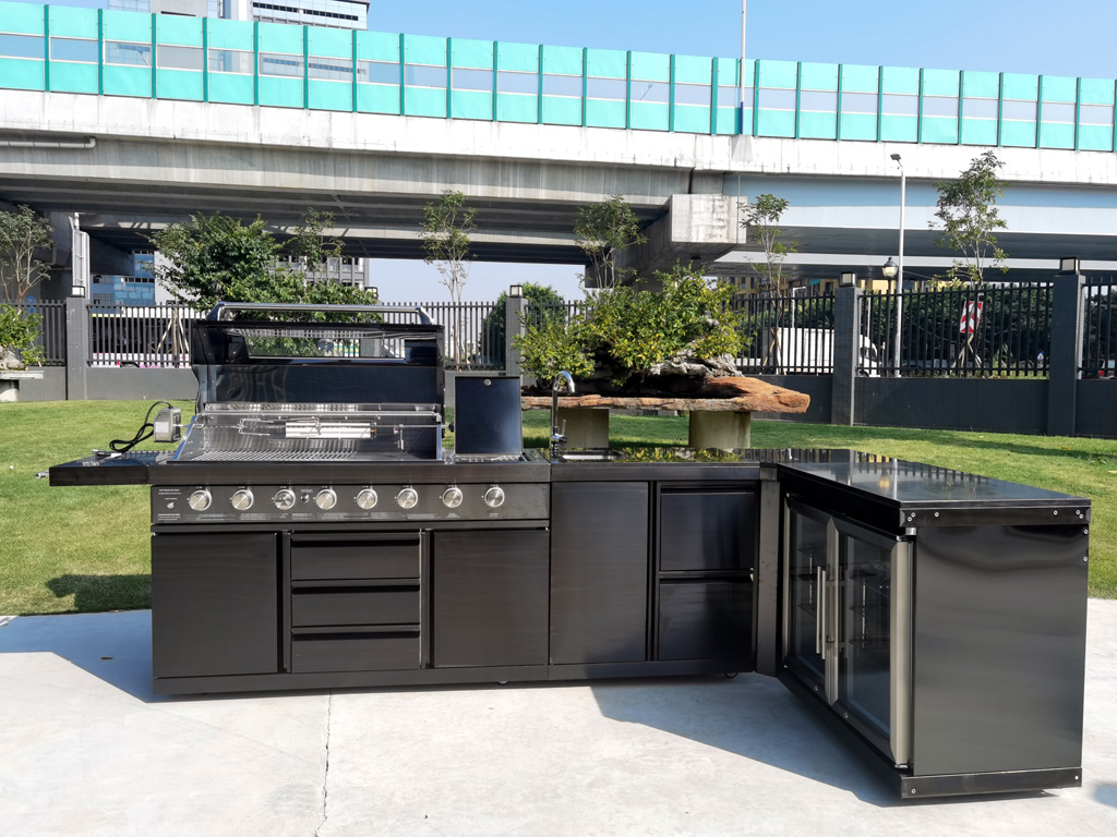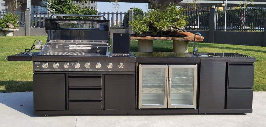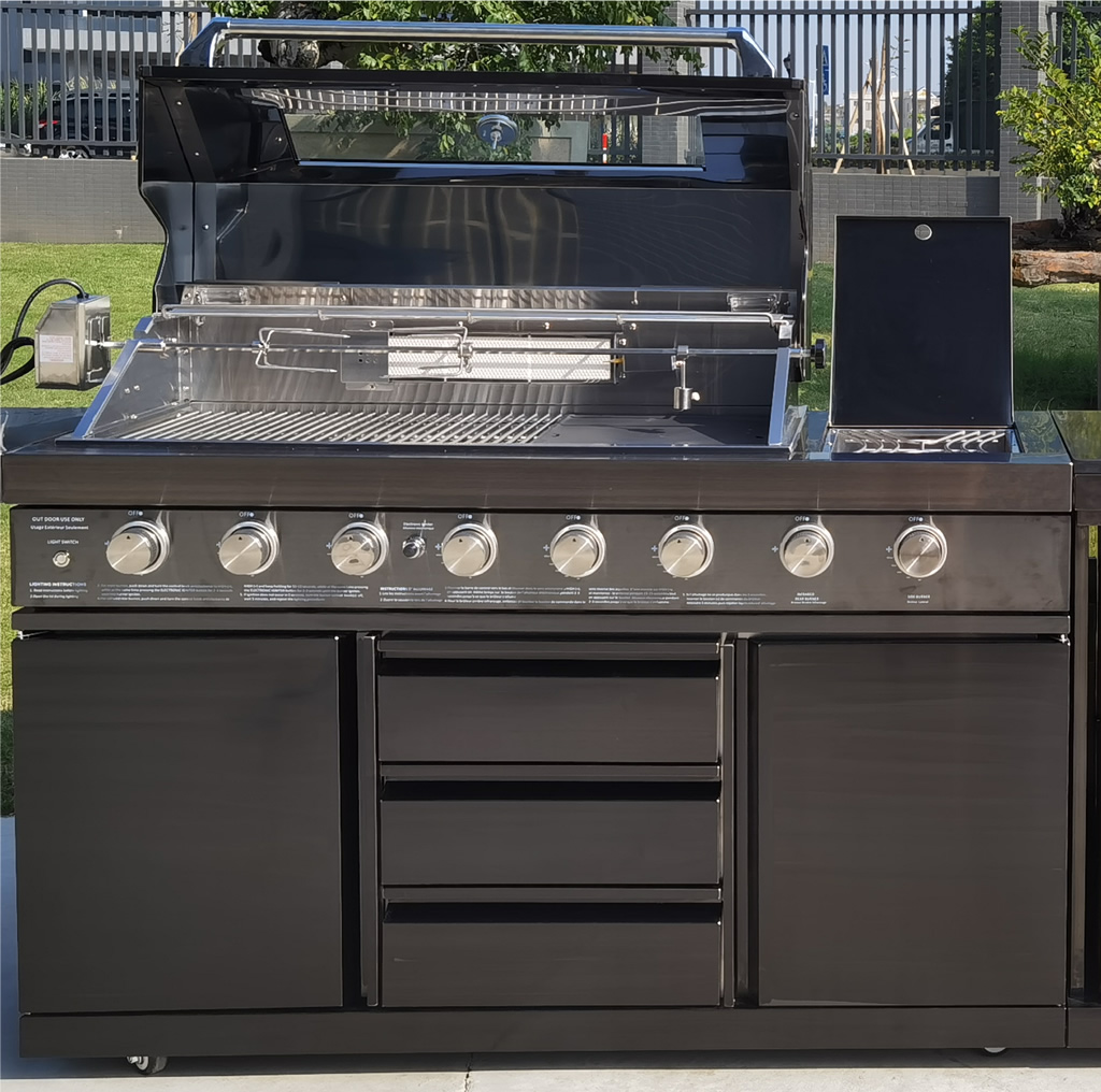 MSRP $10,299! 100% Factory Sealed. High quality sleek design all black stainless steel construction with marble tops! ** Please note this is actual black stainless steel. Other grill manufacturers many times use cheap painted steel. This is NOT painted steel. This unique 3 piece outdoor kitchen comes with an 8 burner grill, twin refrigerator module, and sink module. All 3 sections bolt together to form a solid 1 piece unit. Includes faucet + drain kit, drain plumbing + water line, high quality stainless steel rotisserie package, side burner + rear infrared burner, plus thick waterproof cover included at no charge. Works with LPG propane or natural gas! *Right out of the box it is plug and play with propane. For use with NG, some fittings need to be removed. (We will include instructions) Thick heavy duty lockable castors included on all sections, makes moving it very easy. Latest model with black stainless steel + upgraded interior lighting + 8 exterior blue LED lights make it easy to see at night. New models now also use all metal knobs. We also have a corner piece available for $250 which will make this set into an L shape. Specifications: