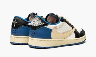 The Travis Scott x Fragment x Air Jordan 1 Low OG is a three way collaboration between the hip-hop star, the Japanese streetwear brand, and Jordan on the low-top iteration of Michael Jordan’s first signature shoe. Joining an Air Jordan 1 High OG, the Travis Scott and Hiroshi Fujiwara-designed Jordan 1 Low OG fuses the singular aesthetic of the rapper and fashion designer onto a progressive design of the retro basketball shoe. Sail leather appears on the perforated toe and mid-panel. Contrasting black tumbled leather graces the toe cap, forefoot, and eyelets. The two-tone white-and-black color block mimics the color cadence of the Air Jordan 1’s original “Black Toe” colorway. The oversized cream leather Swoosh is a nod to the styling of Scott’s first Air Jordan 1 collaboration from 2019. Dual “Cactus Jack” and “Wings” embroidery appear on the heel of the left and right shoe, respectively. Further, Scott’s “face” motif and Fragment’s “lightning bolt” imagery are embossed on the left and right shoe, respectively, as well. Classic “Nike Air” branding is printed in blue on the white nylon tongue tag. The Travis Scott x Fragment x Air Jordan 1 High OG “Military Blue” is one of the most desirable sneaker releases of 2021.