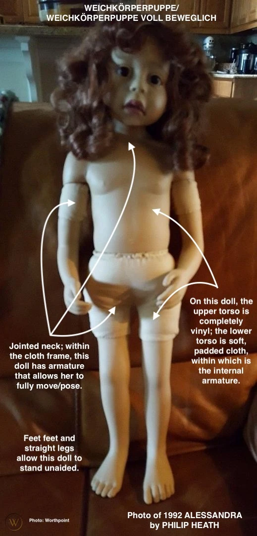 LOVELY RARE PHILLIP HEATH "ALESSANDRA"MADE FOR GOTZ DOLLS!Up For Sale Is ThisBeautiful Rare and High QualityAlessandra Doll Made by the FamousEnglish Doll Artist "Phillip Heath" for the Gotz Doll Company.She is made of high quality vinyl with a cloth torso.All of the finest quality materials were used to create her.Phillip Heath was known as one of the best modern doll Artistand he will be missed in the doll world.Phillip Heath dolls are becoming harder and harder to find.Don't miss your chance to add this beauty to your collection!(Please read their description below and see photos.)BRAND Gotz / GoetzDOLL NAME /MODELALESSANDRAARTISTPhillip Heath, A Famous English Doll Artist( Phillip Heath died November 28, 2011 at age 62 )COLLECTIONWorld of Children CollectionDOLL MARKINGS:On the back of her head: Philip Heaths logo: PSH 192-20ANTIQUE, VINTAGE OR MODERN:ModernMATERIAL:Vinyl Head, arms and legs and cloth torsoEYES:Big brown eyesFACE / HAIR:She has such a sweet face with her medium skin tone.She has full lips that are partially open showing 2 teethShe wears a long curly auburn wigHEIGHT24 inch / 61cmCLOTHING:Her brightly colored silk clothing is so well made.The colors are very brilliant with no tears or fading.She wears the cutest little tie up straw sandals on her feet.DOLL CONDITION:She is in excellent condition