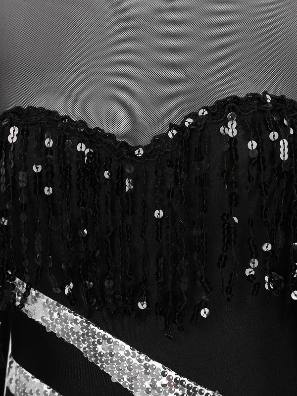 Womens Sheer Mesh Patchwork Langarm Quaste Trikot Pailletten Bodysuit.