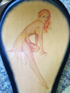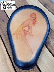 Black Framed Tattoo Seat with Red Head Pin Up Girl, that is embedded into the veg-tanned tooling leather. The image is water resistant, very fade resistant and very abrasion resistant. The leather has a professional clear coat finish that also adds to the durability and water resistance, of the tattoo image. My leather is the finest 100% US made, leather available on the market today. It gives the best image results, and is one of the most durable leather available. The pan is made of 1/8" inch thick steel. This makes it a very rigid and strong seat pan, that will be able to take a lot of abuse. The pan measures 10 1/2" wide by 13 1/2" long. The studs in the rear are spaced 7" apart. Custom sizes are available. I can offer custom sizing because I am the manufacture not an importer of thes