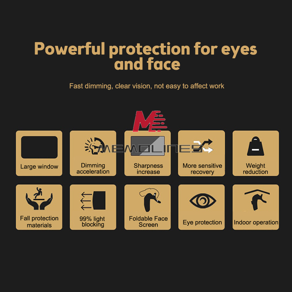 Eye protection: double filters to avoid harmful radiation from ultraviolet and infrared rays generated by the electric arc, as well as welding glare on the eyes to prevent electro-optic ophthalmia.