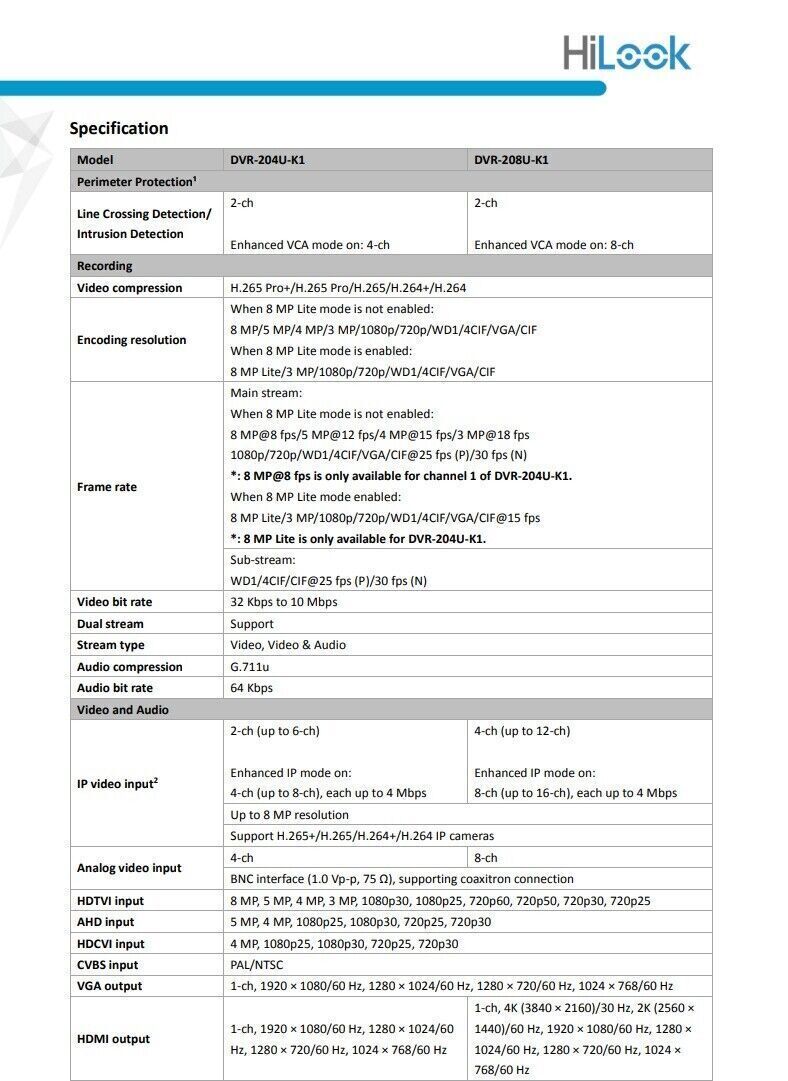 1X 8MP DVR 4 or 8 Channel Hikvision Hilook, (DVR 204U-K1, DVR 208U-K1)