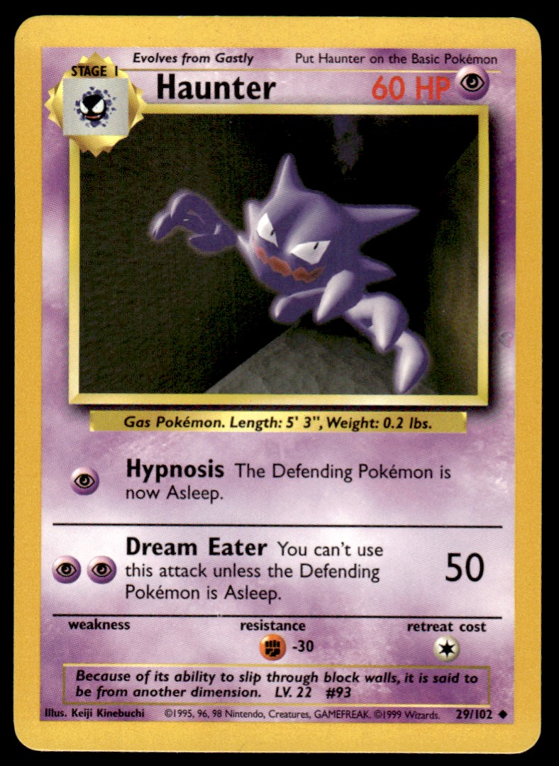 | Description: | Haunter | | Category: | Pokemon | | Year: | 1999 | | Product: | Pokemon | | Set: | Base Set | | Team: | Stage 1/Uncommon | | Card Number: | 29/102 | | Serial Number: | LP-NM | | Dimensions: | 3½" x 2½" |