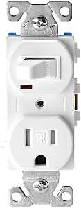 Shutter designed to prevent the insertion of foreign objects. Neon pilot light which is on when switch is on. Switch is horsepower rated for motor loads per UL 20. Thermoplastic toggle, top and backbody. Ultrasonic welding and integrated construction of the strap and body. Tri-combo screw heads. Backwire clamps on side terminals for installation of #12 and #14 AWG wire. Single pole - 15 amp switch, 2-pole, 3-wire tamper resistant receptacle. UL listed, NEMA 5-15.