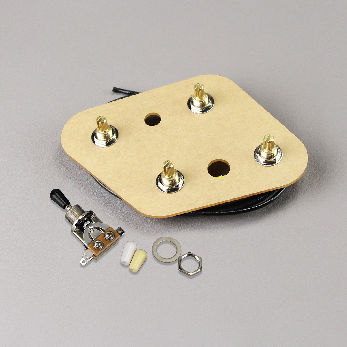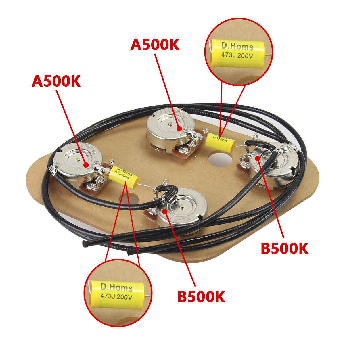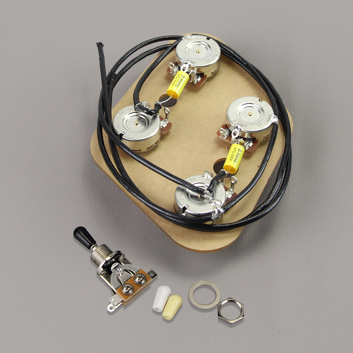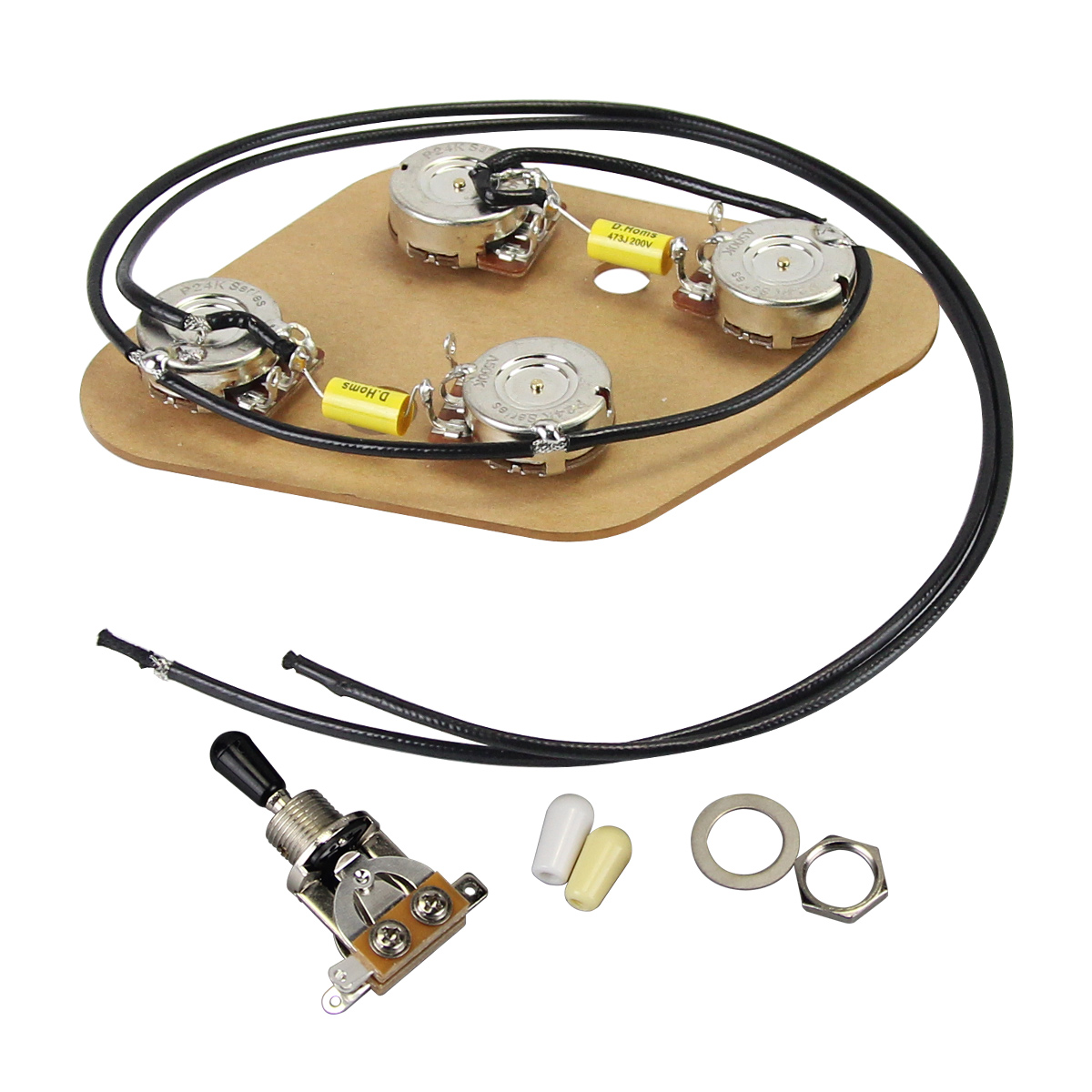 Feature: 100% Brand New and High Quality. Premium Prewired 2T2V Wiring Harness Kit with Separate Switch for LP style electric guitar or similar guitar parts replacement. Assembled and soldered in high quality components, including 500k pots (similar to CTS), capacitors 473J 200V and vintage metal push-back wire with insulation for long life and great sound. Pots in this kit have fine-knurled (24-spline) long split shaft, 500K pots for 2T2V control. Separate 3-Way Toggle Switch with black/white/cream colors tips (not pre-soldered), without jack! Upgrade your old wiring.The wiring for this harness is the same as for the LP. Each Prewired Wiring Harness is mounted on a plate to hold the components correctly,only used to shipping protection and help your wiring project work easier,it do not get installed in your guitar. Specification: Pot :Fine 24-spline Potentiometer,Long Split Shaft,2pcs A500K & 2pcs B500K pots. Pot Shaft Diameter: Approx.6mm (1/4"). Pot Threaded Shaft Diameter: Approx. 9.5mm (3/8" ). Pot Shaft Length: Approx. 19mm. Pot Base Size: Approx.24mm. Capacitor: 0.047uF 473J 200V . Package Includes: Prewired 2T2V Wiring Harness Kit 3-Way Toggle Switch with tips