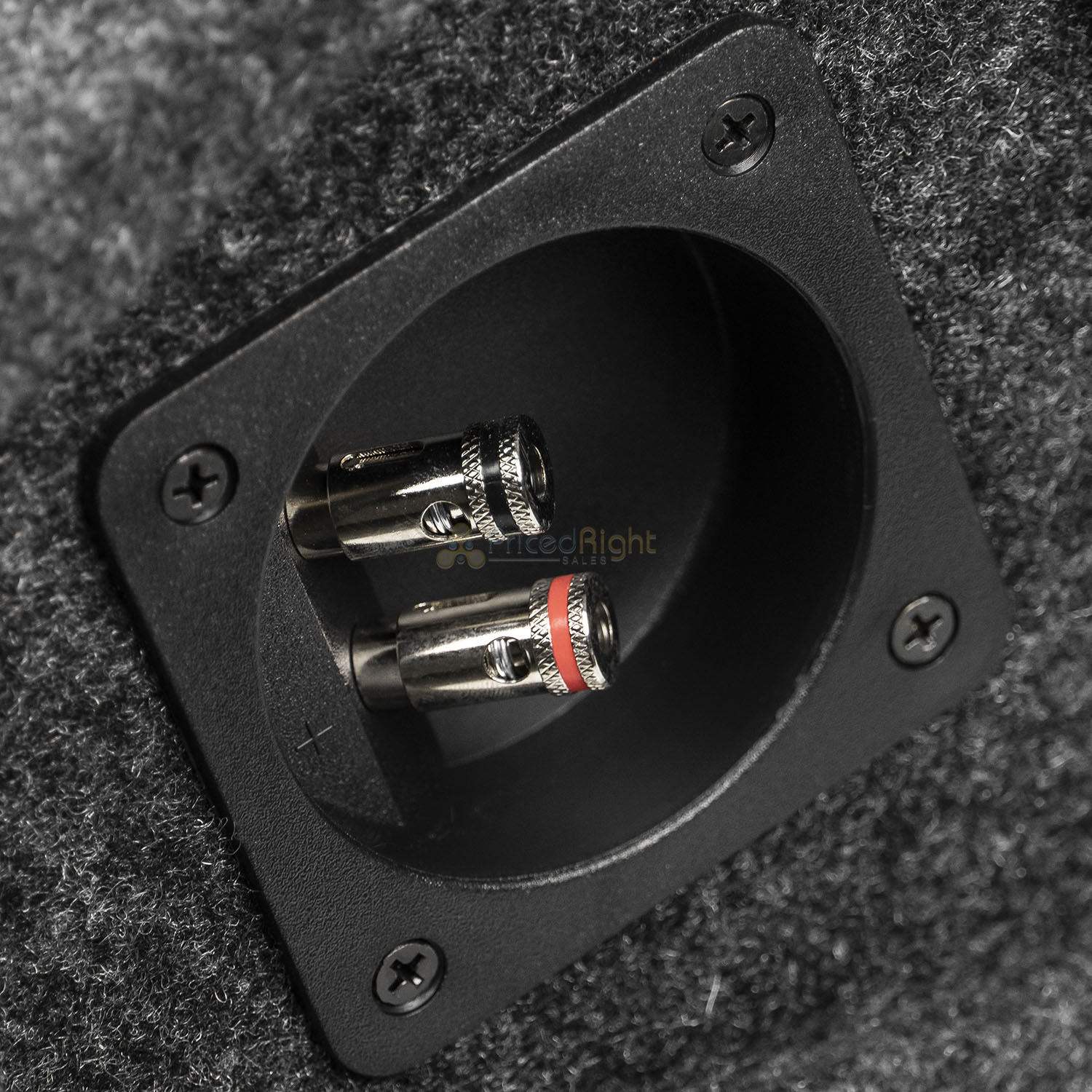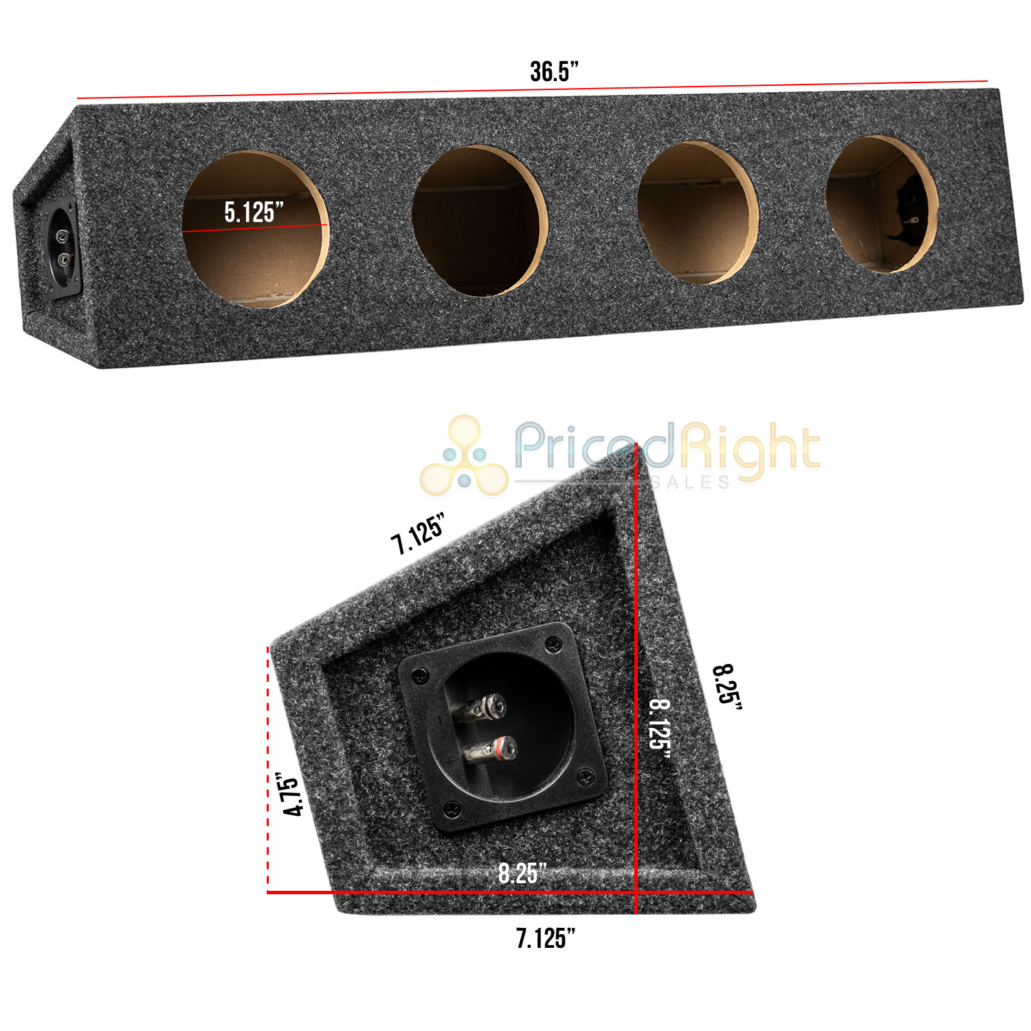 Brand new four-way 6.5" carpeted speaker box from RI Audio. With its four 6.5" speaker mounting holes, this speaker box will help your system deliver big sound while keeping a clean and sleek look inside your vehicle. This box is constructed out of sturdy 1/2" MDF, wrapped in a durable charcoal carpet, and features two pre-installed terminals for each speaker chamber to make installation as easy as possible. This speaker box also has a 1/2" MDF divider in the center of the speaker box to divide the box into two separate chambers (two speakers per chamber). Please see below for more details and specifications.
