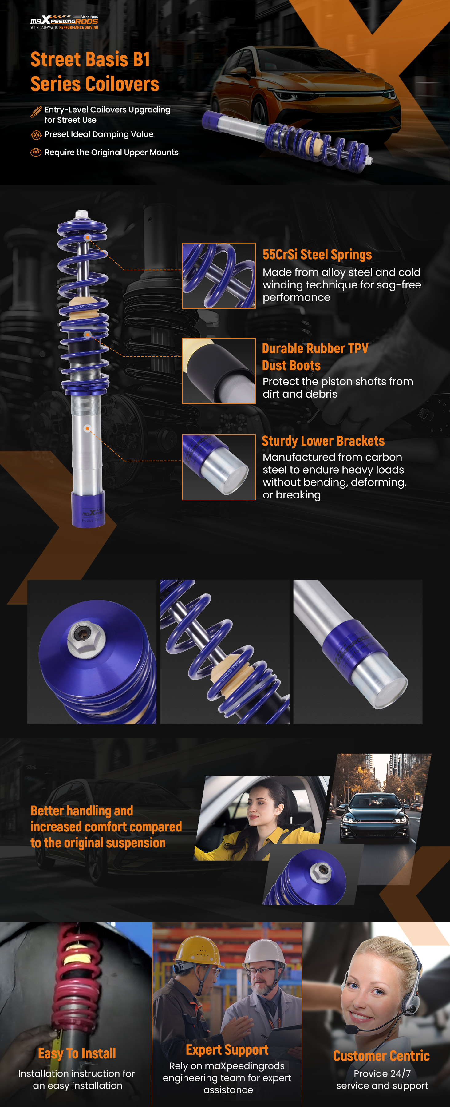 Die Serie MXR-B1 von maXpeedingrods ist ideal for diejenigen, die die alte abgenutzte Strebe wechseln wollen, aber gleichzeitig die Handhabung verbessern möchten. Es ist höhenverstellbar und behält die OE-Fahrqualität im größten Umfang.