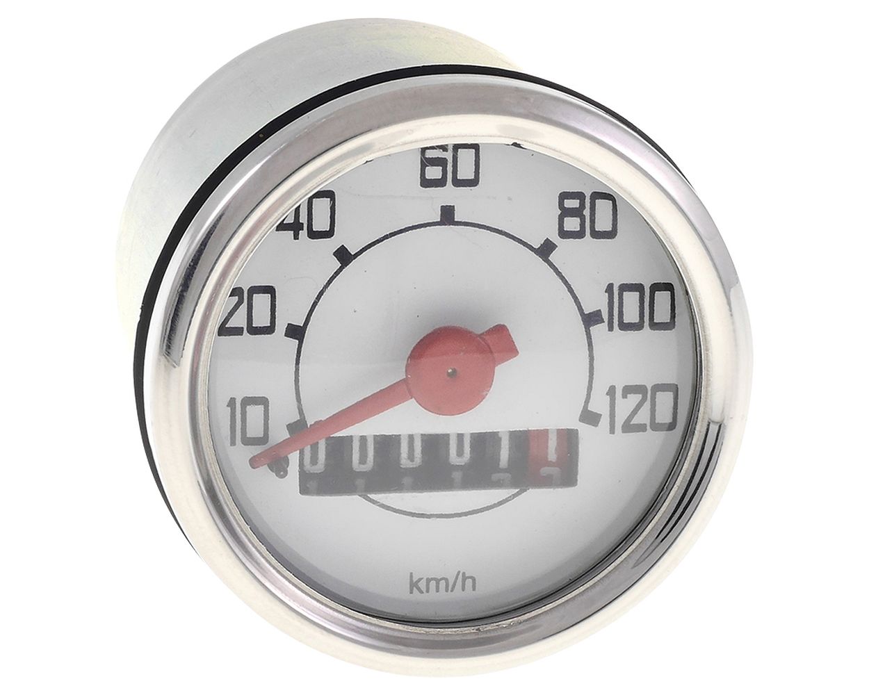 Tachometer UNI AUTO bis 80 km/h mit KM Zähler, Chrom, rund 48mm kompatibel für Vespa V50, 50 N, L, R, S, Piaggio CIAO, SI, Bravo, Grillo, Boxer