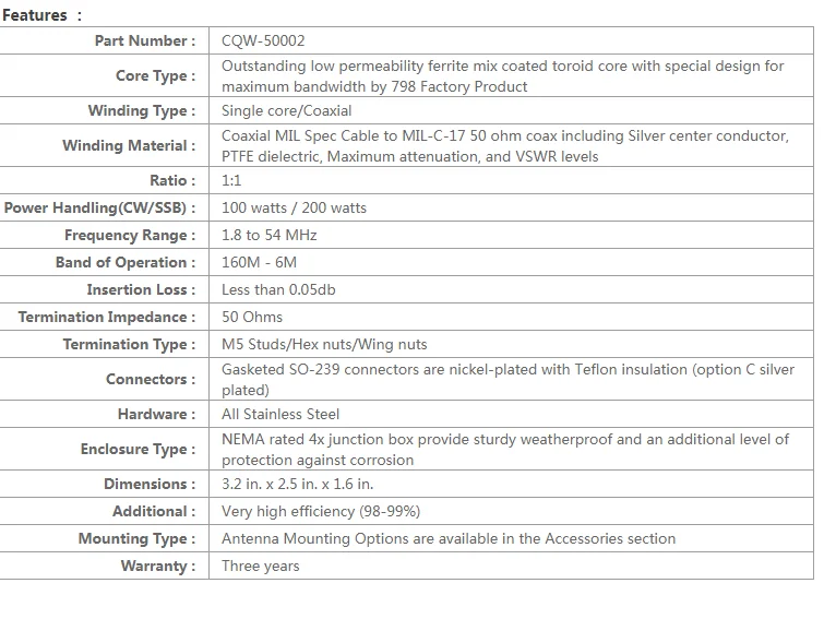 QRP Balun CQW-50002 1:1 200w HF Shortwave Current Antenna Balun 1.8-54MHz