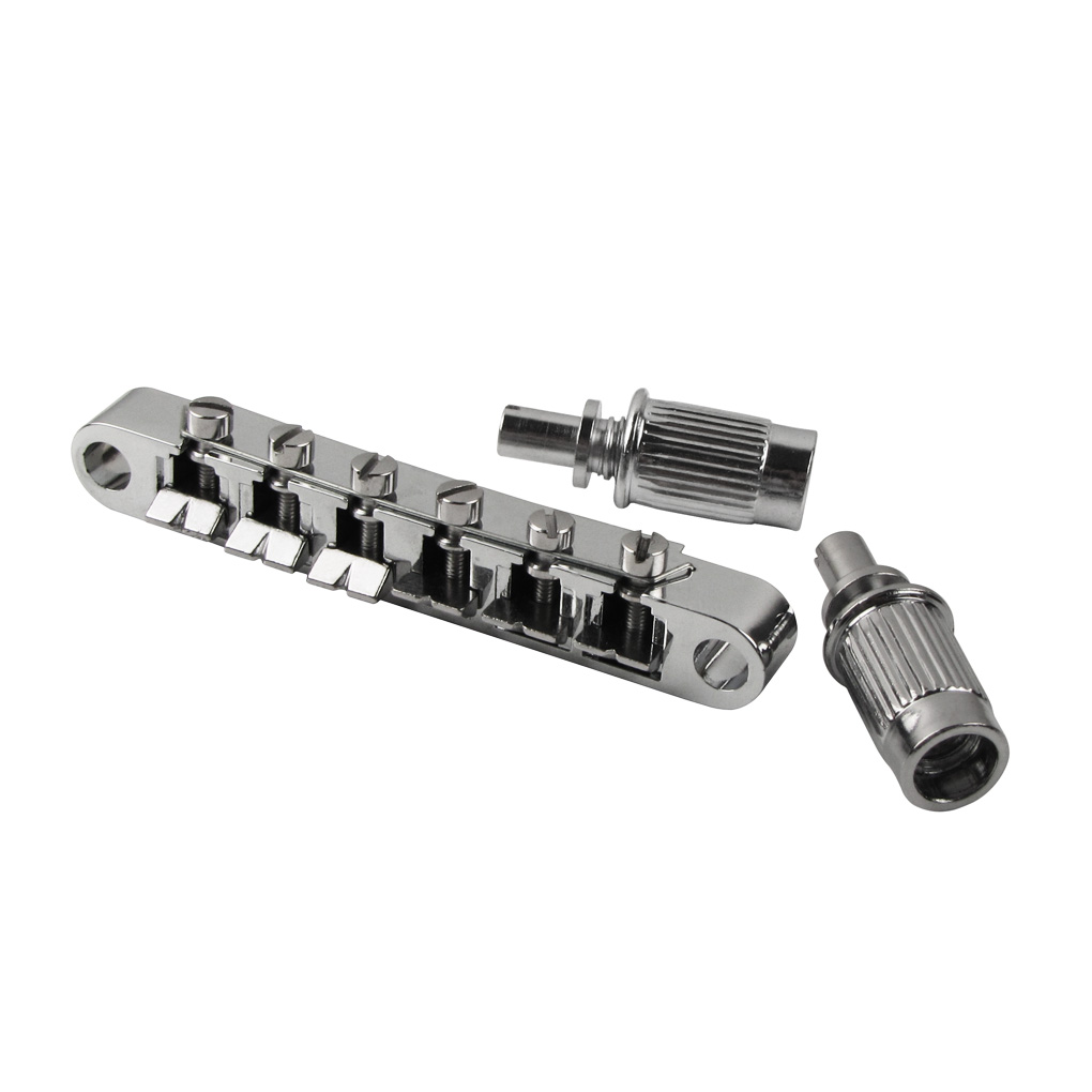 Features: Tune O Matic bridge, suitable for LP style or similar guitar. Individual slotted saddles with "E" retaining clips. Allows for extremely fast and precise individual string height action adjustments as well as for accurate individual intonation adjustments. Tune O Matic guitar bridge includes 2 matching posts. Overall Length: Approx. 83mm. Width: Approx. 11.5mm. String Spacing: Approx. 10.5mm. The distance of strings from E to E: Approx. 52mm. Distance between two post hole centers: Approx. 73mm. Color:Chrome color. Package Includes: 1 Set Guitar bridge with studs