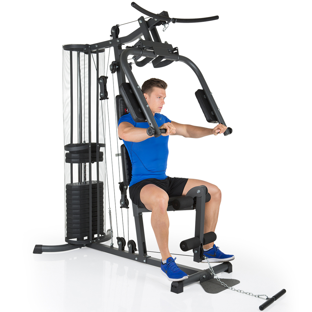 - LIEFERUMFANG: Multigym Ultra mit bis zu 80 kg Widerstand (60 kg Gewichtsblock) mit gummierter Latzugstange, hochwertiger Curlstange und 3 Qualitäts-Karabiner
