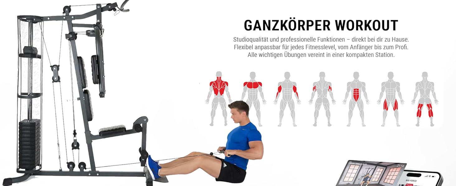 PRODUKTMERKMALE KRAFTTRAINING FÜR ZU HAUSE: Die Fülle an verschiedenen Übungen, die die Kraftstation Ultra abdeckt, ist enorm, so dass eine Vielzahl von Muskelgruppen in einem Workout mit der Ultra angesprochen werden können. Sie haben ein vollständiges Training für einen minimalen Platzaufwand – das perfekte Gerät für zuhause! EFFEKTIVER BEINTRAINER: Für den Aufbau der Beinmuskulatur bietet das Gerät eine Beincurl-Einheit, wodurch Sie optimal Ihre Oberschenkel trainieren können BRUST- UND RÜCKENTRAINING: Die Drückeinheit kann sowohl nach vorne (Bankdrücken), als auch nach hinten (Rudern) justiert werden. Durch die Beanspruchung verschiedener Muskelgruppen wird sich Ihre Leistung im Hinblick auf Muskelaufbau und Fettabbau deutlich verbessern und es können in naher Zukunft beeindruckende Ergebnisse zu bewundern sein HOCHWERTIGE VERARBEITUNG: Die Stahlrohr-Konstruktion ergibt ein sehr wertiges Bild, das Ihren Fitnessraum/-bereich optisch aufwerten wird. Die hochwertige Verarbeitung und stabile Konstruktion bietet ein ruckfreies Training und ermöglicht volle Konzentration auf die Übungsausführung. LIEFERUMFANG: Multigym Ultra mit bis zu 80 kg Widerstand (60 kg Gewichtsblock) mit gummierter Latzugstange, hochwertiger Curlstange und 3 Qualitäts-Karabiner