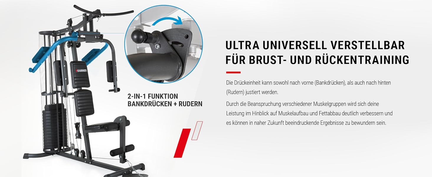 - BRUST- UND RÜCKENTRAINING: Die Drückeinheit kann sowohl nach vorne (Bankdrücken), als auch nach hinten (Rudern) justiert werden. Durch die Beanspruchung verschiedener Muskelgruppen wird sich Ihre Leistung im Hinblick auf Muskelaufbau und Fettabbau deutlich verbessern und es können in naher Zukunft beeindruckende Ergebnisse zu bewundern sein