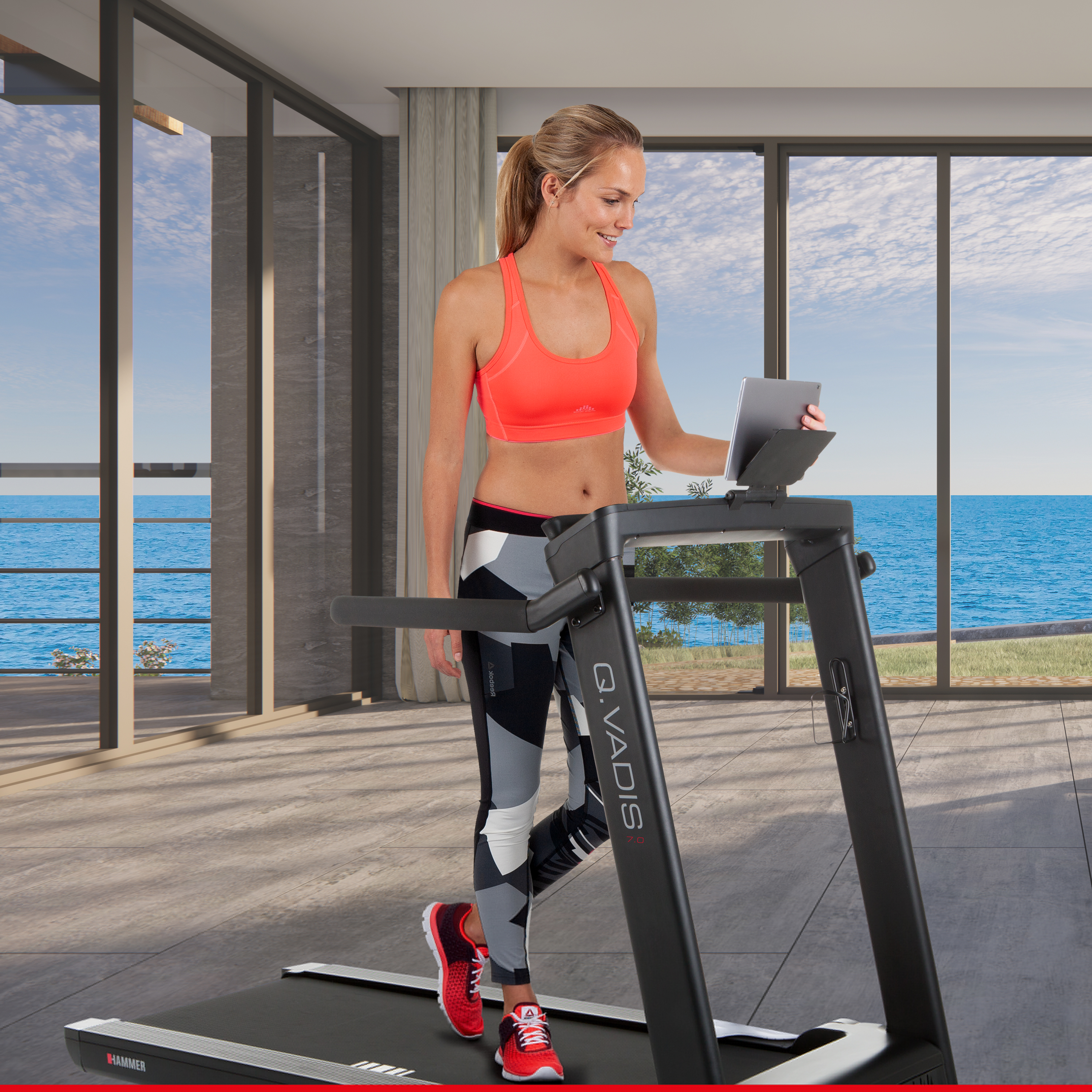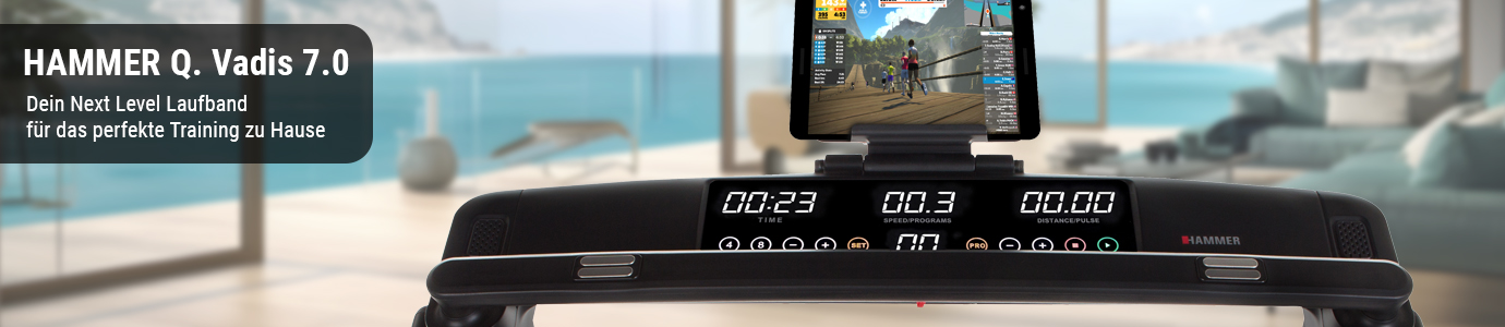 Dein Laufband-Kalorienkiller Mit dem Q.VADIS 7.0 bekommst du ein Spitzen-Laufband für dein regelmäßiges Ausdauertraining. Tauche ein in ein neues Lauffeeling und erreiche deine gesetzten Ausdauer- und Laufziele effektiv und schnell. Erlebe multimediales Lauftraining und lass dich von zu Hause aus begeistern. Mit den innovativen Features des Q.VADIS 7.0 bist du auf der richtigen Laufbahn und kannst mit bis zu 22 km/h lossprinten. Die 3 PS Leistung des Laufbandmotors wird dir ordentlich Beine machen und dich nach vorne treiben. Ein Trinkflaschenhalter ist ebenfalls am Laufband vorhanden, damit du immer genügend Flüssigkeitsnachschub bei dir hast. Mit innovativen Fitness-Apps, wie ZWIFT, baust du Abwechslung in dein Workout. Die durchdachte Bauweise lässt dein Q.VADIS 7.0 schnell in senkrechter Position zusammenklappen und spart dir somit jede Menge Platz. Das Profi Laufband überzeugt mit seinem modernen, schlichten Look und wird so zum Blickfang in deiner Wohnung.