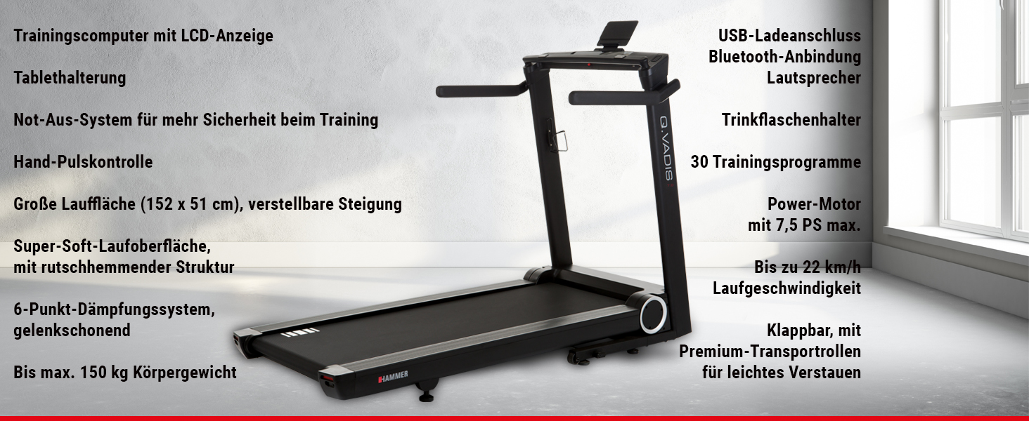 PRODUKTMERKMALE IHR LAUFBAND-KALORIENKILLER: Mit dem Q.VADIS 7.0 bekommen Sie ein Spitzen-Laufband für Ihr regelmäßiges Ausdauertraining. Tauchen Sie in ein neues Lauffeeling ein und erreichen Sie Ihre gesetzten Ausdauer- und Laufziele effektiv und schnell. Mit den innovativen Features des Q.VADIS 7.0 sind Sie auf der richtigen Laufbahn und können mit bis zu 22 km/h lossprinten. Die 3 PS Leistung des Laufbandmotors wird Ihnen ordentlich Beine machen und Sie nach vorne treiben. KLAPPBAR UND PLATZSPAREND: Auch bei einem knappen Wohnraum lässt Ihnen Ihr Laufband trotzdem genügend Platz für ein angenehmes Wohngefühl. Mit der einfachen und innovativen Klappfunktion des Q. VADIS 7.0 können Sie das Laufband nach dem Training schnell zusammenklappen. Dabei lässt sich die Lauffläche in eine vollkommen senkrechte Position verstellen und ist damit deutlich platzsparender als viele andere Modelle. KINOMAP UND ZWIFT KOMPATIBEL: Virtuell im Live-Erlebnis starten Sie mit Fitness-Apps durch und bekommen immer wieder neue Laufimpulse. Installieren Sie die APPs Kinomap und ZWIFT auf Ihrem Tablet. Verbinden Sie anschließend einfach und schnell via Bluetooth mit dem Q.VADIS 7.0 Computer. Mit ZWIFT laufen Sie durch faszinierende Landschaften und mit einer globalen Community. Laufen Sie gemeinsam Ihre Kilometer ab und trainieren Sie mit anderen Sportlern aus der ganzen Welt. GENUG PLATZ BEIM LAUFEN: Die Laufbandfläche (2,5 mm stark) bietet mit 152 x 51 cm genügend Platz und gibt Ihnen die nötige Bewegungsfreiheit, während Sie Ihre Trainings-Kilometer zurücklegen. Dank der stabilen Bauweise können Personen mit einem Körpergewicht von bis zu 150 kg bedenkenlos ein authentisches Laufgefühl genießen. Die optimale Breite von 51 cm bietet die perfekten Bedingungen für ein sicheres Training. LAUFENDE PROGRAMMVIELFALT: Für Ihre Laufeinheiten stehen Ihnen volle 30 Trainingsprogramme zur Verfügung. Jedes Programm ist in 10 Abschnitten unterteilt und mit jedem Abschnitt legen Sie 200 m zurück. Nachdem Sie die 10 Abschnitte erfolgreich durchlaufen haben, wiederholt sich das Trainings-Programm. Das Q.VADIS 7.0 gibt Ihnen die Möglichkeit, entsprechend Ihrer gesetzten Herzfrequenz sicher zu trainieren. Dafür stehen Ihnen an der Laufbandkonsole Pulshandgriffe zur Verfügung.