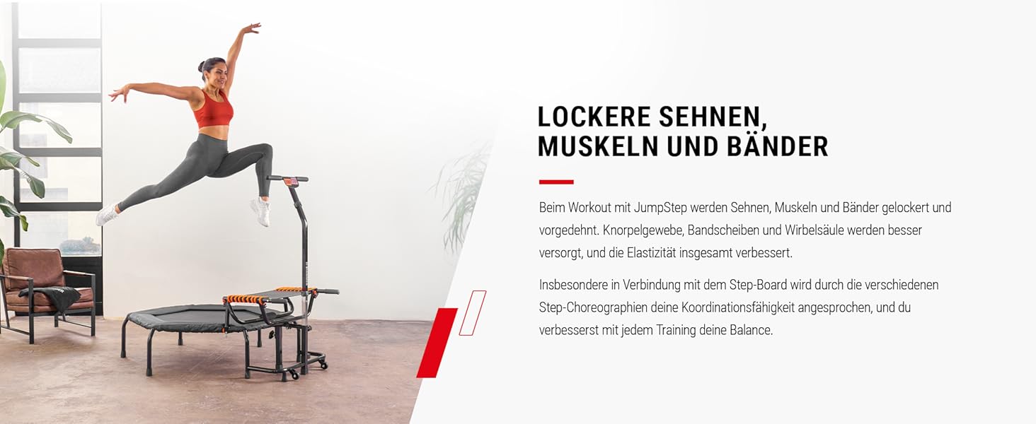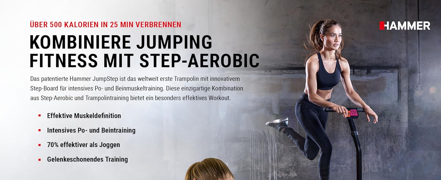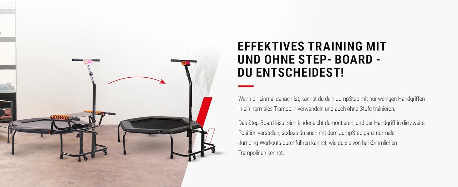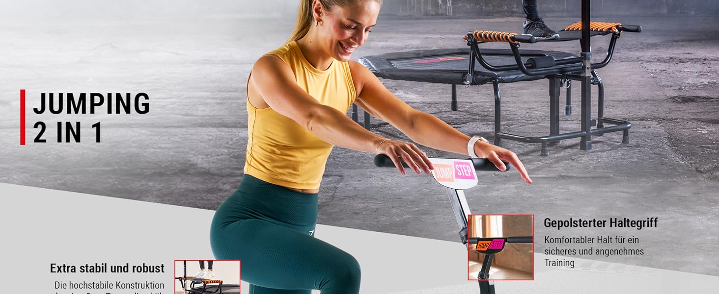 - JUMPING 2 in 1: Trampolin mit innovativem Step-Board für intensives Po- und Beinmuskeltraining. Unendliche Sprungfolgen mit einem Mega-Spaß-Faktor. Kombination aus Step-Aerobic und Trampolintraining. Gewinner des PLUS X AWARD in den Kategorien Innovation, High Quality, Design und Funktionalität!