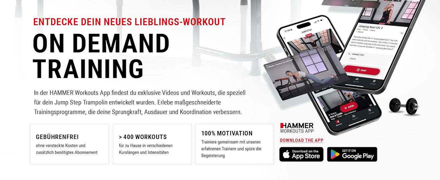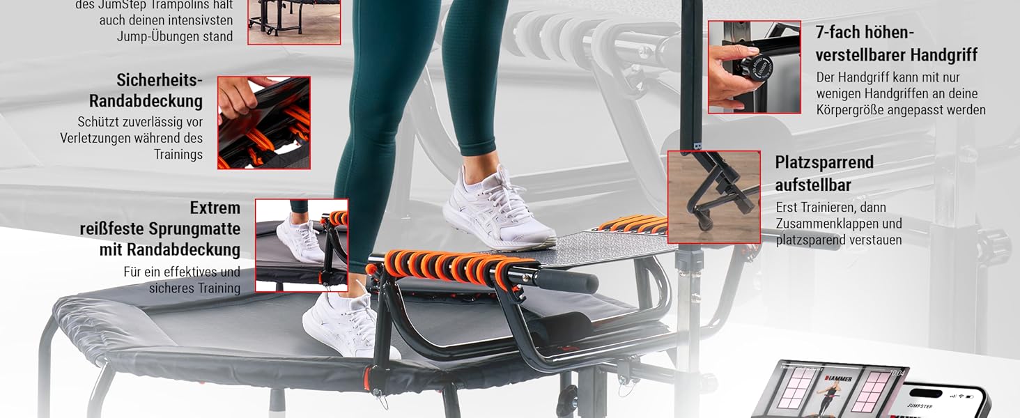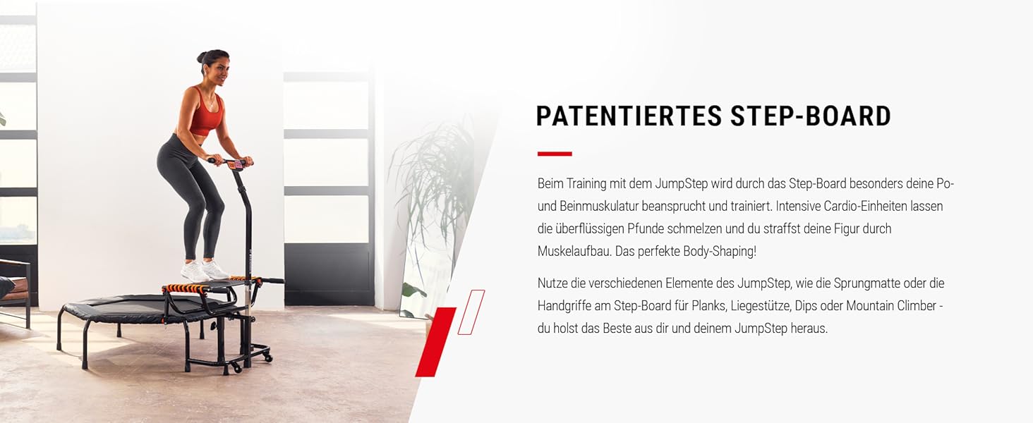 PRODUKTMERKMALE JUMPING 2 in 1: Trampolin mit innovativem Step-Board für intensives Po- und Beinmuskeltraining. Unendliche Sprungfolgen mit einem Mega-Spaß-Faktor. Kombination aus Step-Aerobic und Trampolintraining. Gewinner des PLUS X AWARD in den Kategorien Innovation, High Quality, Design und Funktionalität! HOHER KALORIENVERBRAUCH: Gleichzeitig Kalorien verbrennen und Muskeln definieren! Intensive Cardio-Einheiten mit gleichzeitiger Straffung Deiner Figur durch Muskelaufbau ERGONOMISCH HÖHENVERSTELLBARER HANDGRIFF: Der ergonomische Handgriff ist 7x höhenverstellbar und kann mit nur wenigen Handgriffen an die jeweilige Körpergröße angepasst werden 3 TRAININGSVIDEOS INKLUSIVE: Mit dem Kauf Deines JumpSteps erhältst Du Zugang zu drei intensiven und abwechslungsreichen Trainingsvideos. Wir haben Dir gemeinsam mit unseren Jumping Trainern drei unterschiedliche Programme zusammengestellt, die Dich ordentlich zum Schwitzen bringen werden. Ob Cardio, Dance oder Shape - mit diesen Workouts verbrennst Du innerhalb von 20 Minuten mehr Kalorien als z.B. beim Joggen und formst dabei Deinen Traumkörper. Mega-Spaß und mega effektiv! HÖCHSTE STABILITÄT, SICHERHEIT UND PLATZSPAREND AUFSTELLBAR: 150 kg Gewichtsbelastung, Anti-Rutsch-Füße, hochstabile Konstruktion, hochelastische Gummizüge, extrem reißfeste Sprungmatte, Sicherheitsrandabdeckung. In Sekundenschnelle ist das JumpStep auch aufgestellt und kann platzsparend verräumt werden