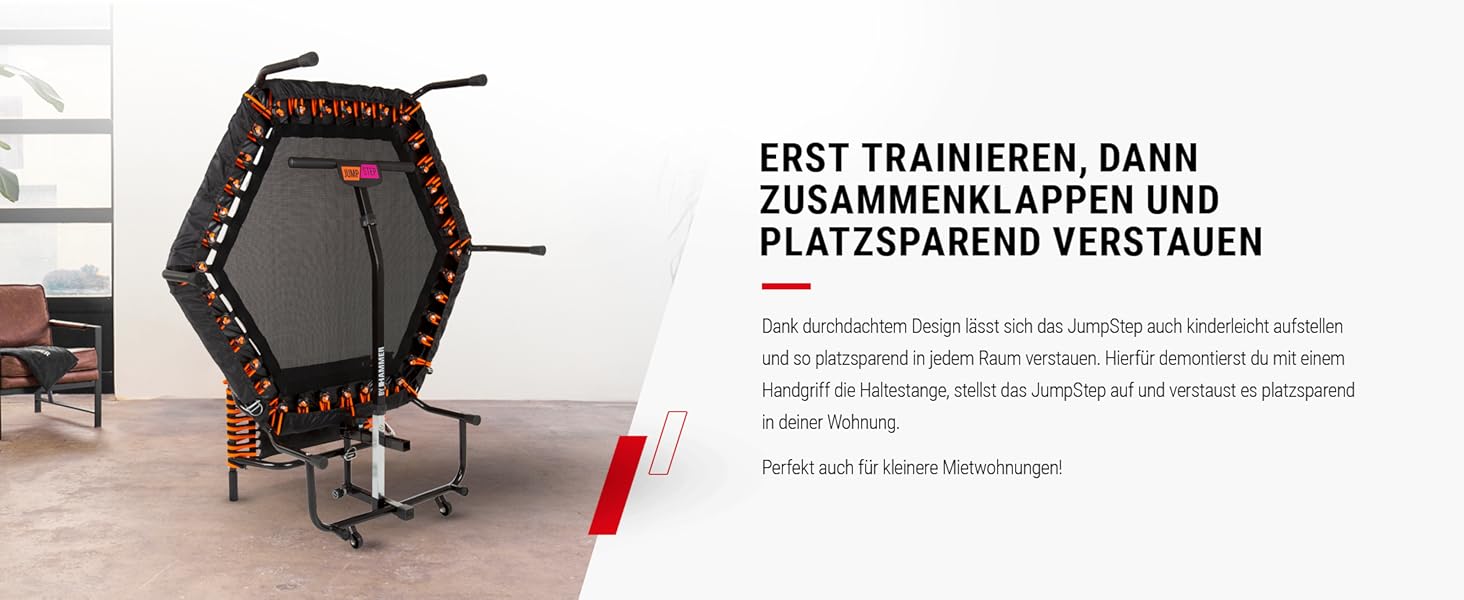 - HÖCHSTE STABILITÄT, SICHERHEIT UND PLATZSPAREND AUFSTELLBAR: 150 kg Gewichtsbelastung, Anti-Rutsch-Füße, hochstabile Konstruktion, hochelastische Gummizüge, extrem reißfeste Sprungmatte, Sicherheitsrandabdeckung. In Sekundenschnelle ist das JumpStep auch aufgestellt und kann platzsparend verräumt werden