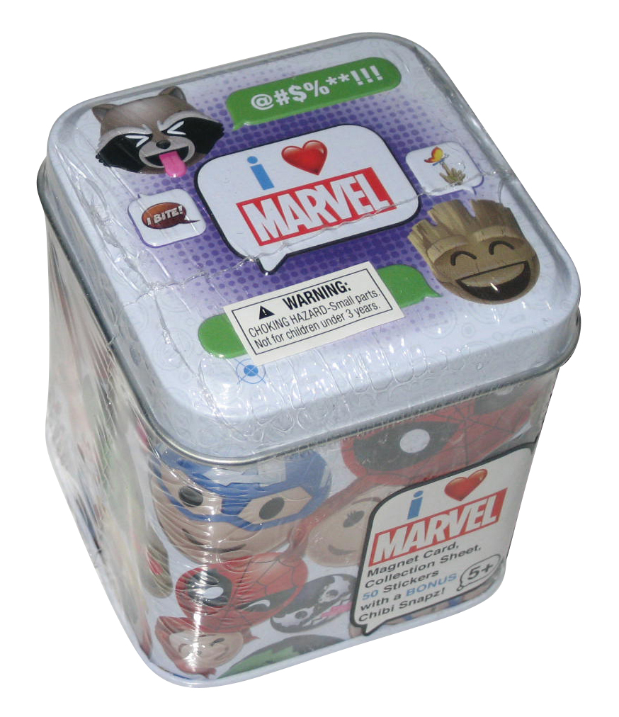 Made by Bullsitoy! Tin includes 1 magnet card, 1 collection sheet, 50 stickers and 1 chibi snapz.