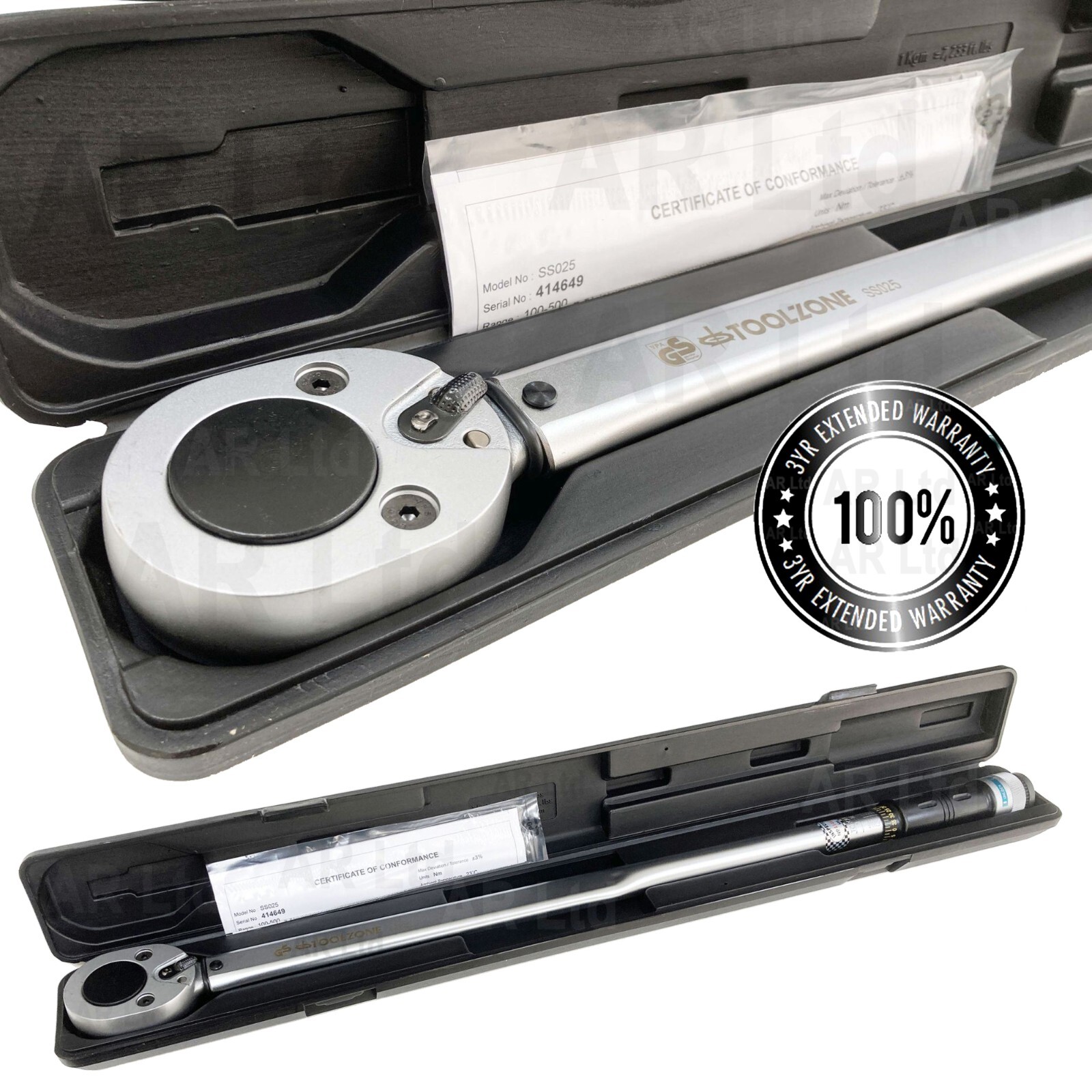 Toolzone 3/4 Inch Square Drive Torque Wrench is the largest I have ever seen being 87cm+ long! It comes with a Calibration Certificate and Conversion Chart. It meets VPA/GS standards with a range of 100-500Nm (73.7562 to 368.781 ft-lbs)