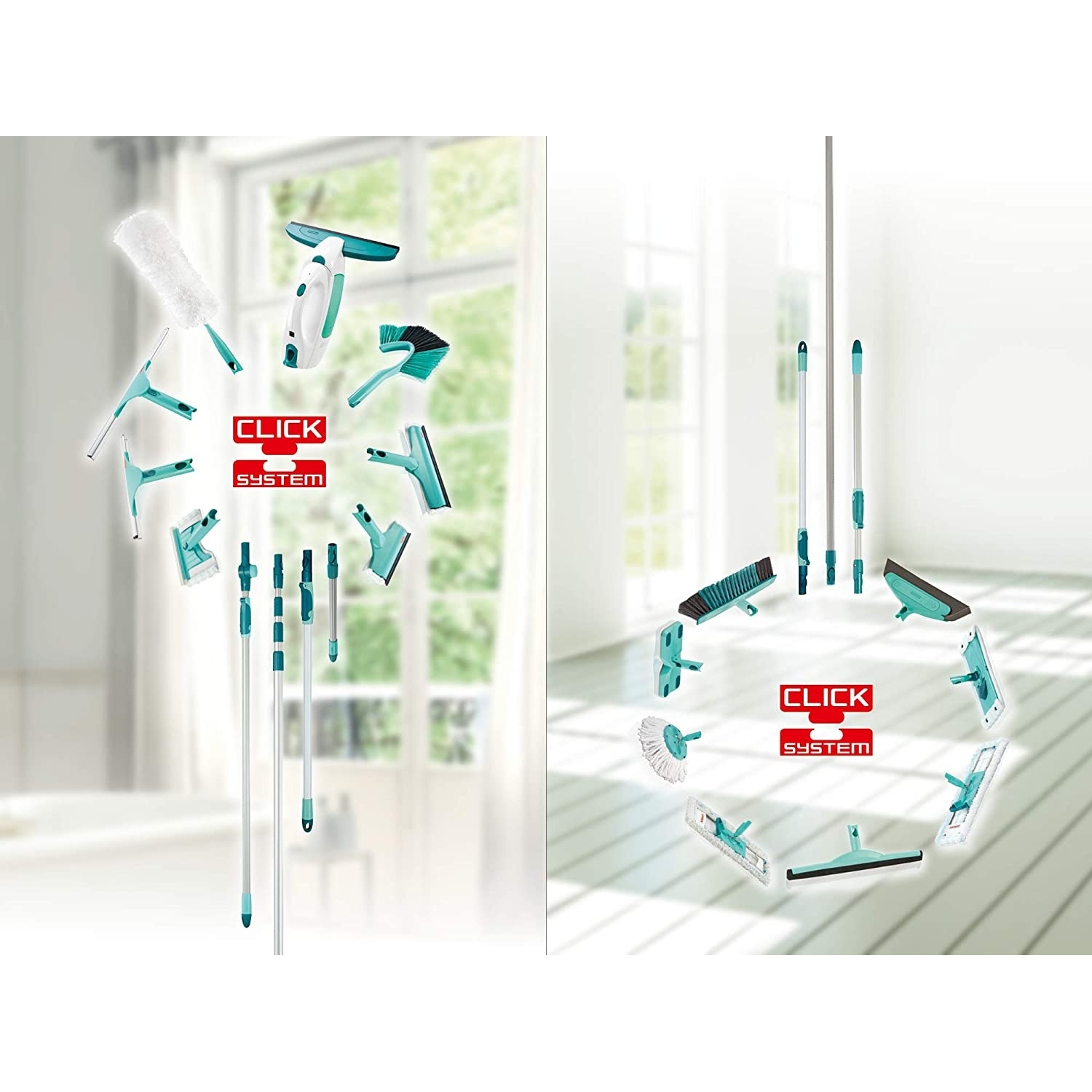• Click-System - Das Putzsystem verfügt über das patentierte Leifheit Click-System: dank speziellem Aufsatz sind verschiedene Stiele in Kombination mit dem Reiniger möglich