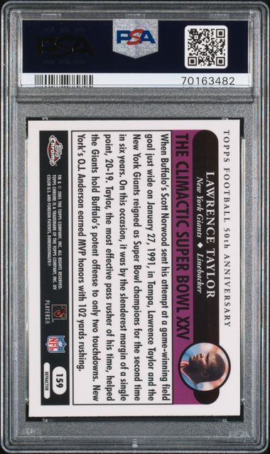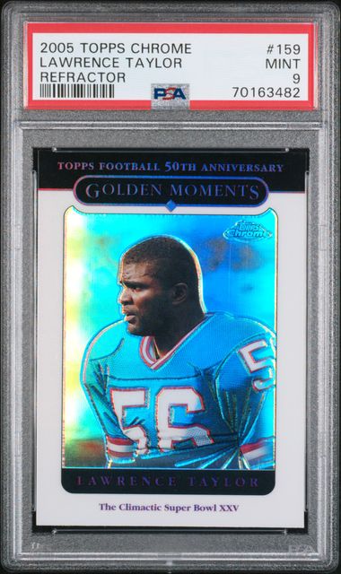 🔥🔥💎💎 RARE & GORGEOUS low Population 1 of only 1! 2005 Lawrence Taylor TOPPS CHROME 50th ANNIVERSARY REFRACTOR CARD #159. This is graded by Professional Sports Authenticator (PSA) as a Mint Condition 9.
