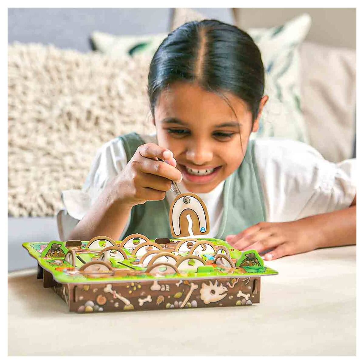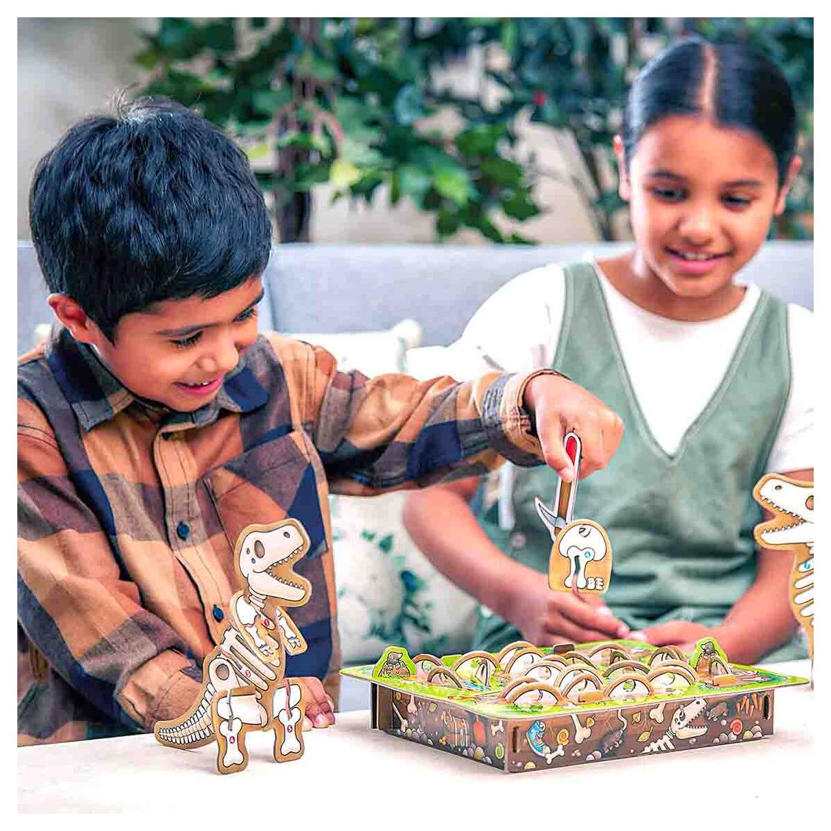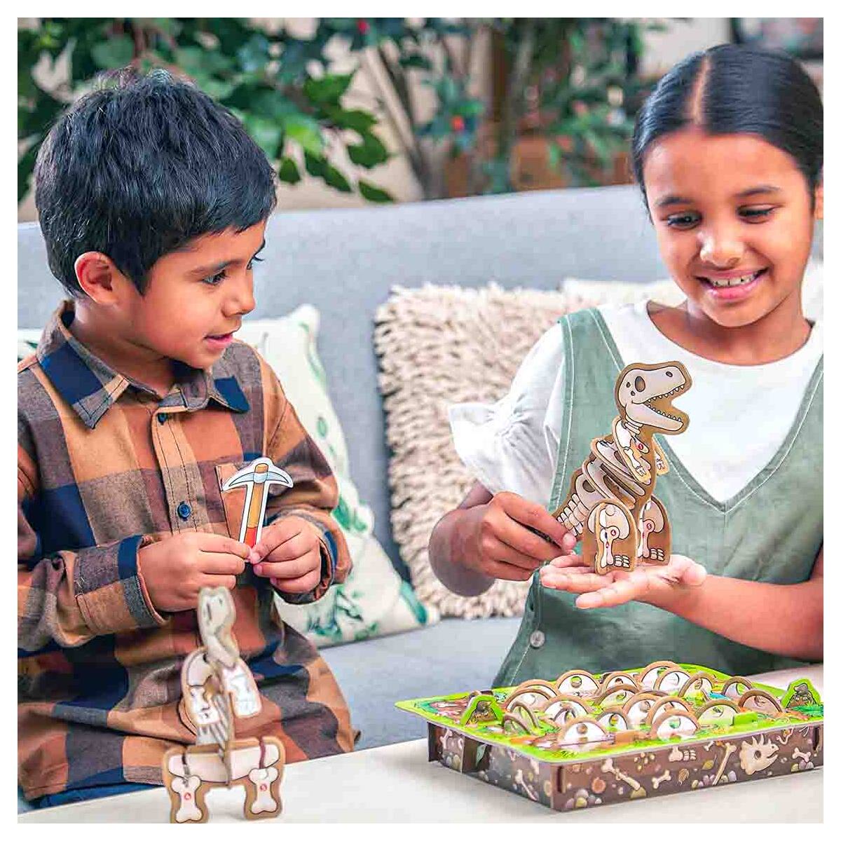 The game Orchard Toys Dinosaur Dig requires you to hunt out every bone necessary to assemble your 3D dinosaur. The pick colour chosen by each participant matches the colour of their dinosaur. A dinosaur bone is hooked from the 3D board by each player in turn. If the colour of the number matches their chosen colour, they can attach the piece to their dinosaur body! Nevertheless, if you hook a T-Rex card, a piece of your dinosaur will be lost and returned to the board. The player who finishes their dinosaur first wins. With the help of this captivating 3D prehistoric game, players will have a great time honing their matching and memorization abilities and promoting the development of dexterity.