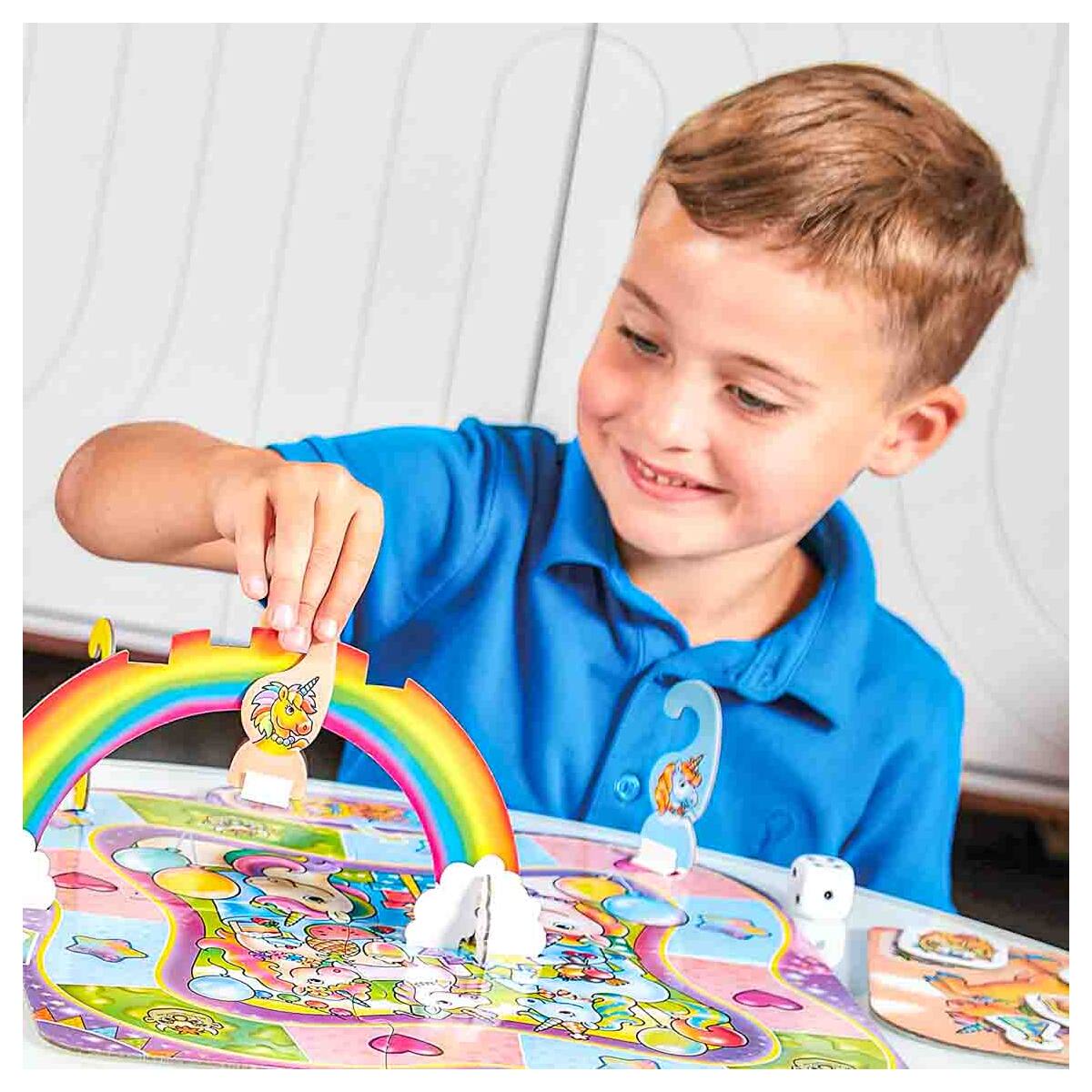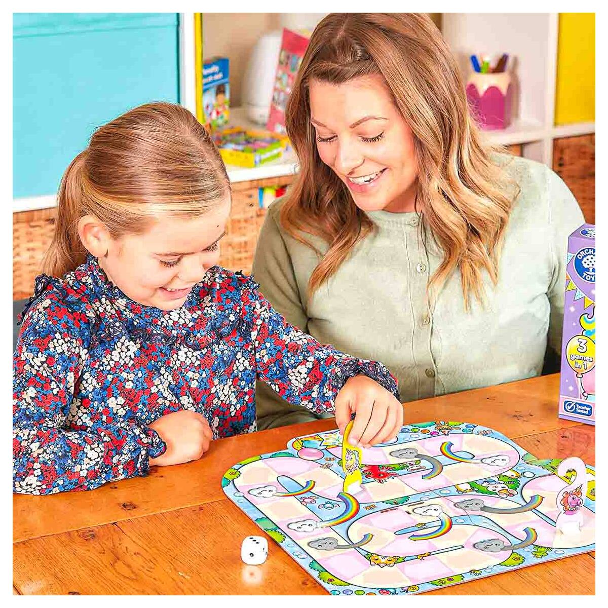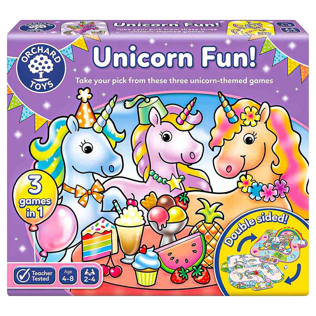 Orchard Toys Unicorn Fun! is three games in one box! Help the unicorns get to the party in this exciting board game or turn the board over for a game of unicorn-themed snakes and ladders. you can also use the unicorn boards as a mix and match activity and unleash your creativity with different outfit combinations! Game 1: Take turns to travel around the board collecting items for your unicorn, cross the rainbow and be the first to get to the Unicorn Party. Game 2: Follow the magical path climbing up happy clouds and shooting down sad clouds in this fun twist on Snakes and Ladders in Happy Cloud, Sad Cloud. Game 3: Roll the dice and add item cards to your unicorn in this fun Build a Unicorn game!