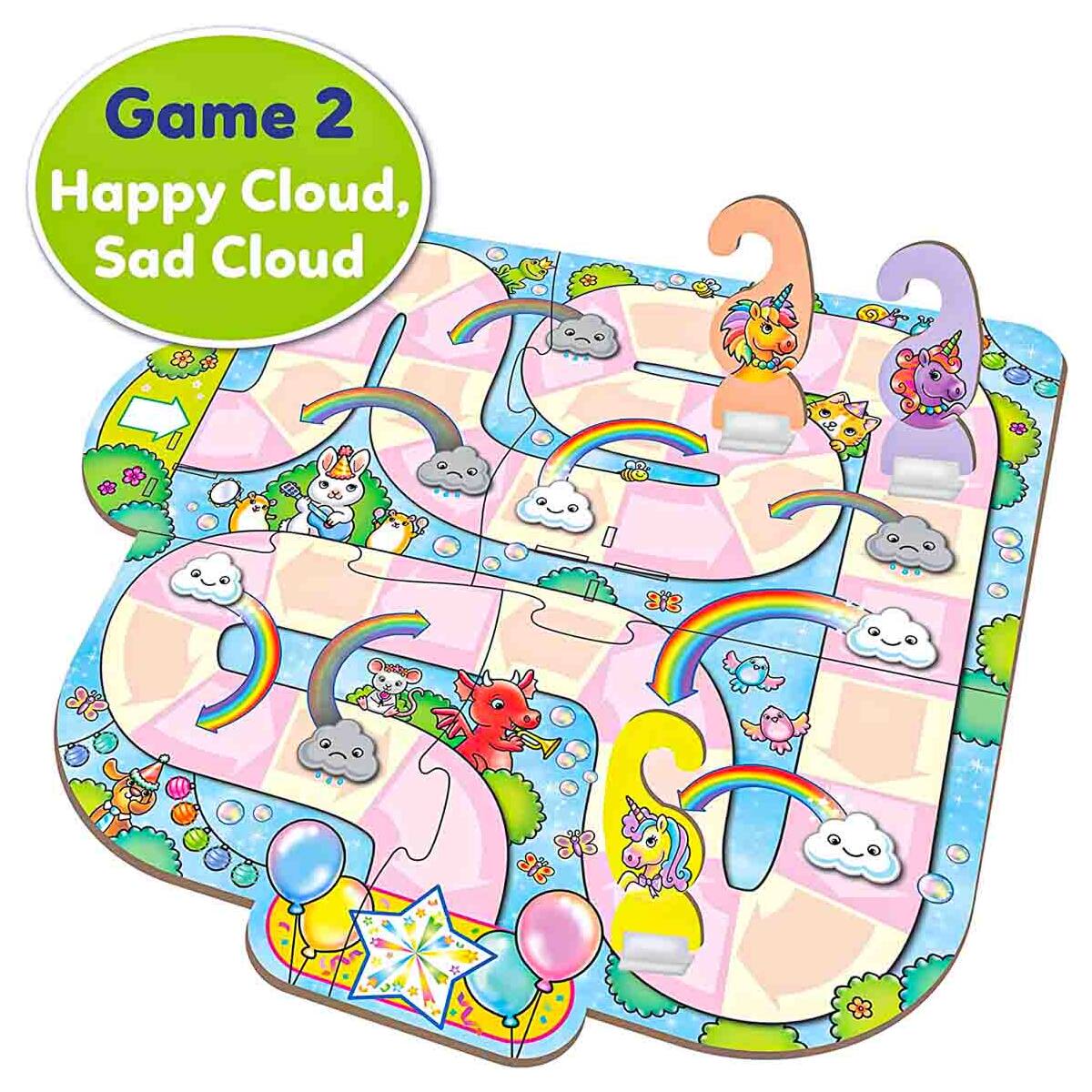 Game 2: Happy Cloud, Sad Cloud: Follow the magical path climbing up happy clouds and shooting down sad clouds in this fun twist on Snakes and Ladders!