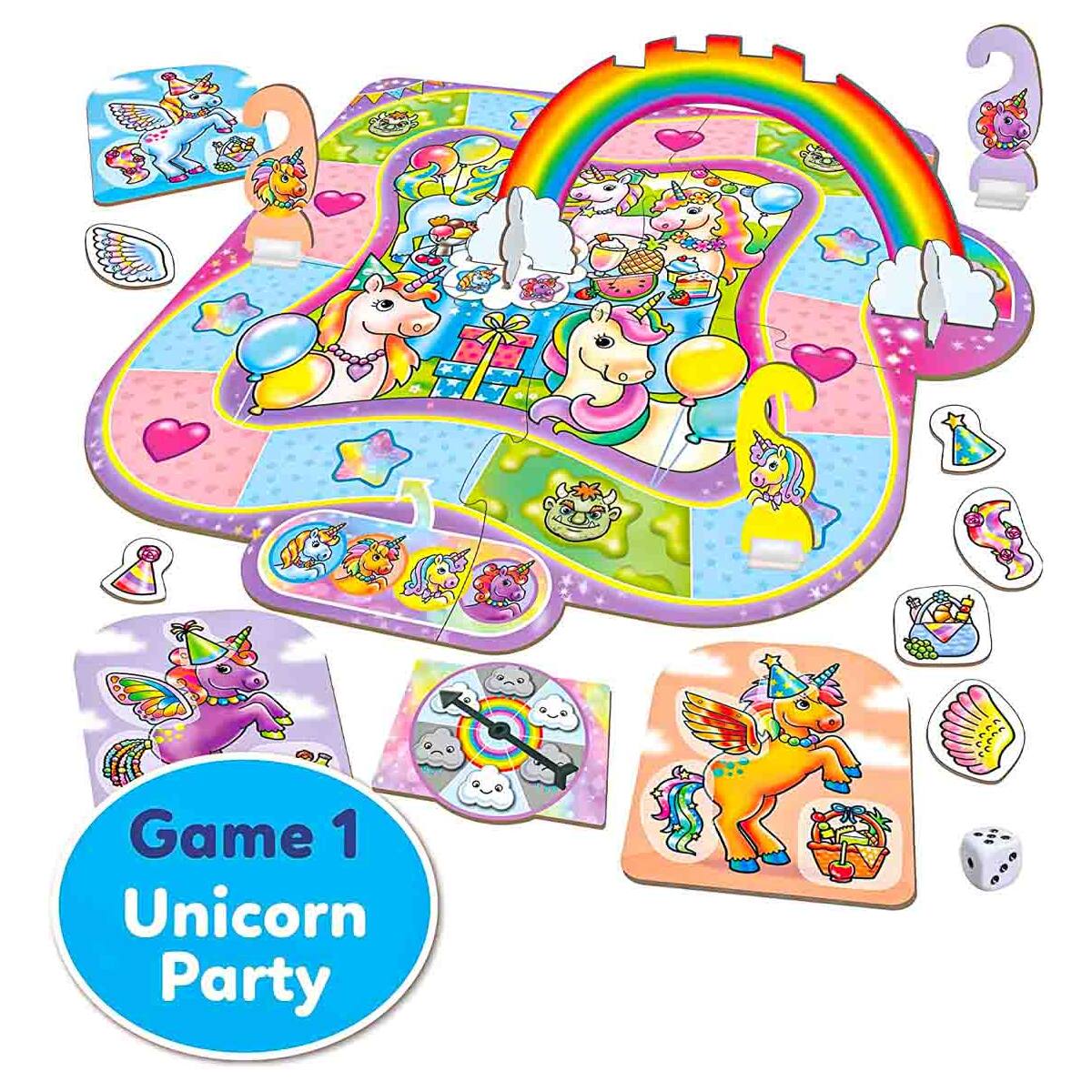 Game 1: Unicorn Party: Take turns to travel around the board collecting items for your unicorn, cross the rainbow and be the first to get to the unicorn party!