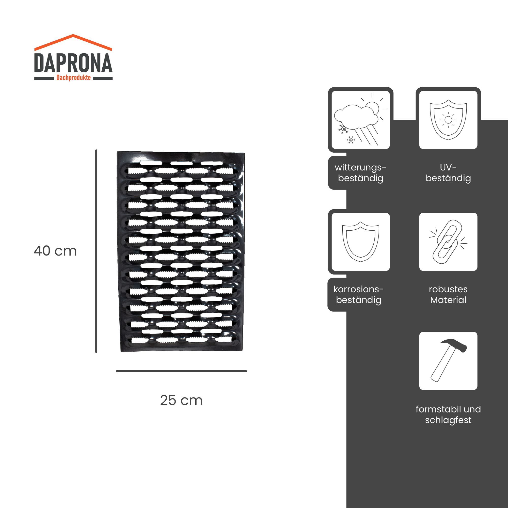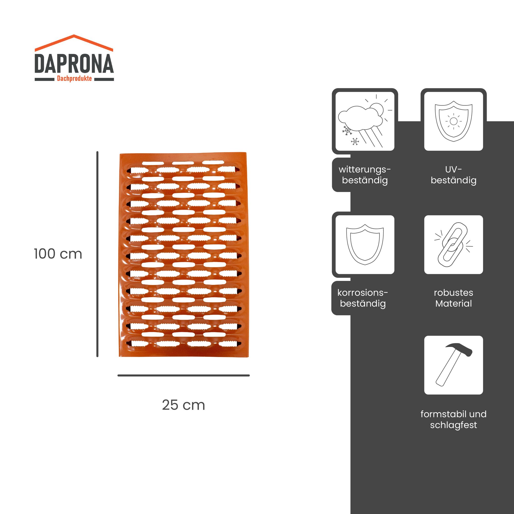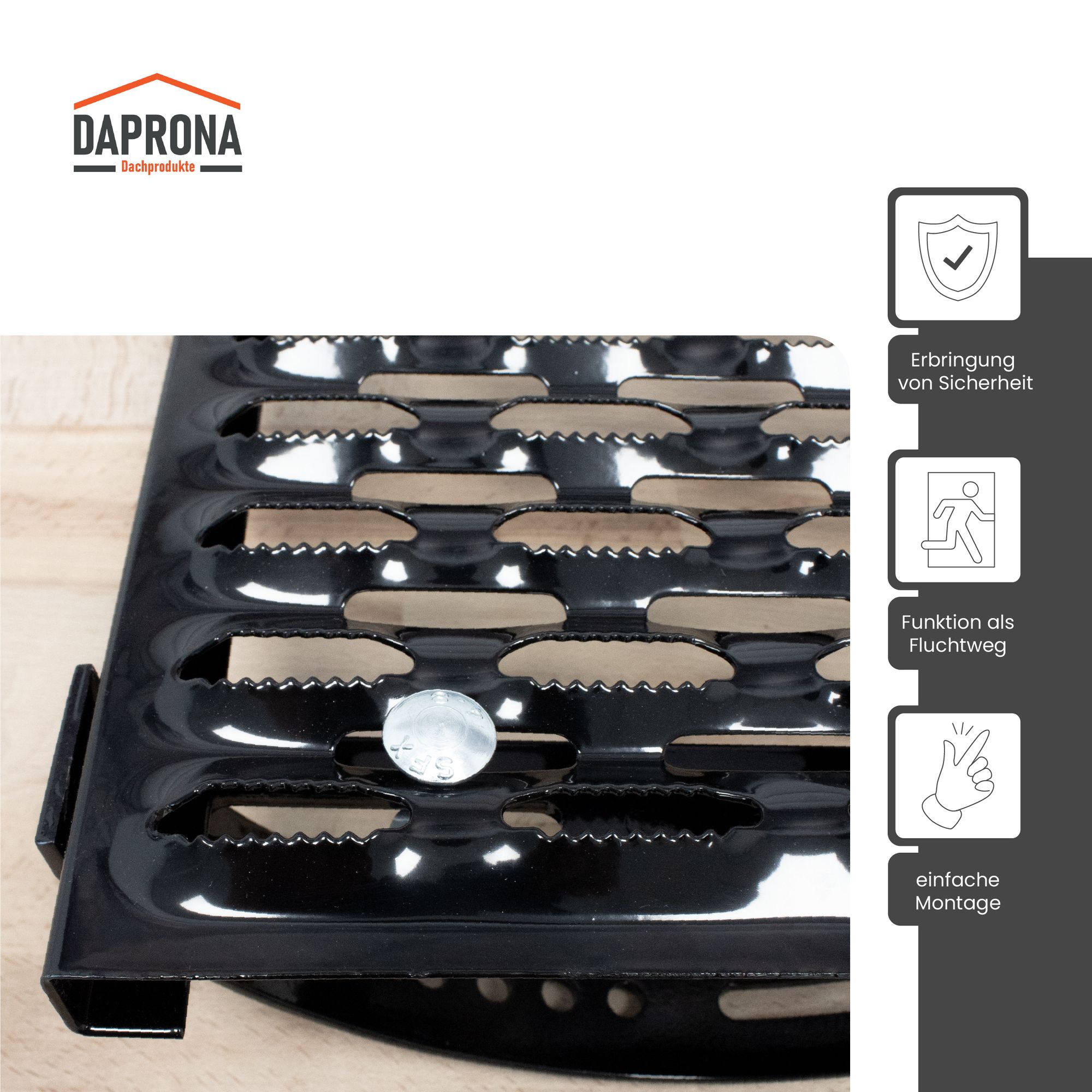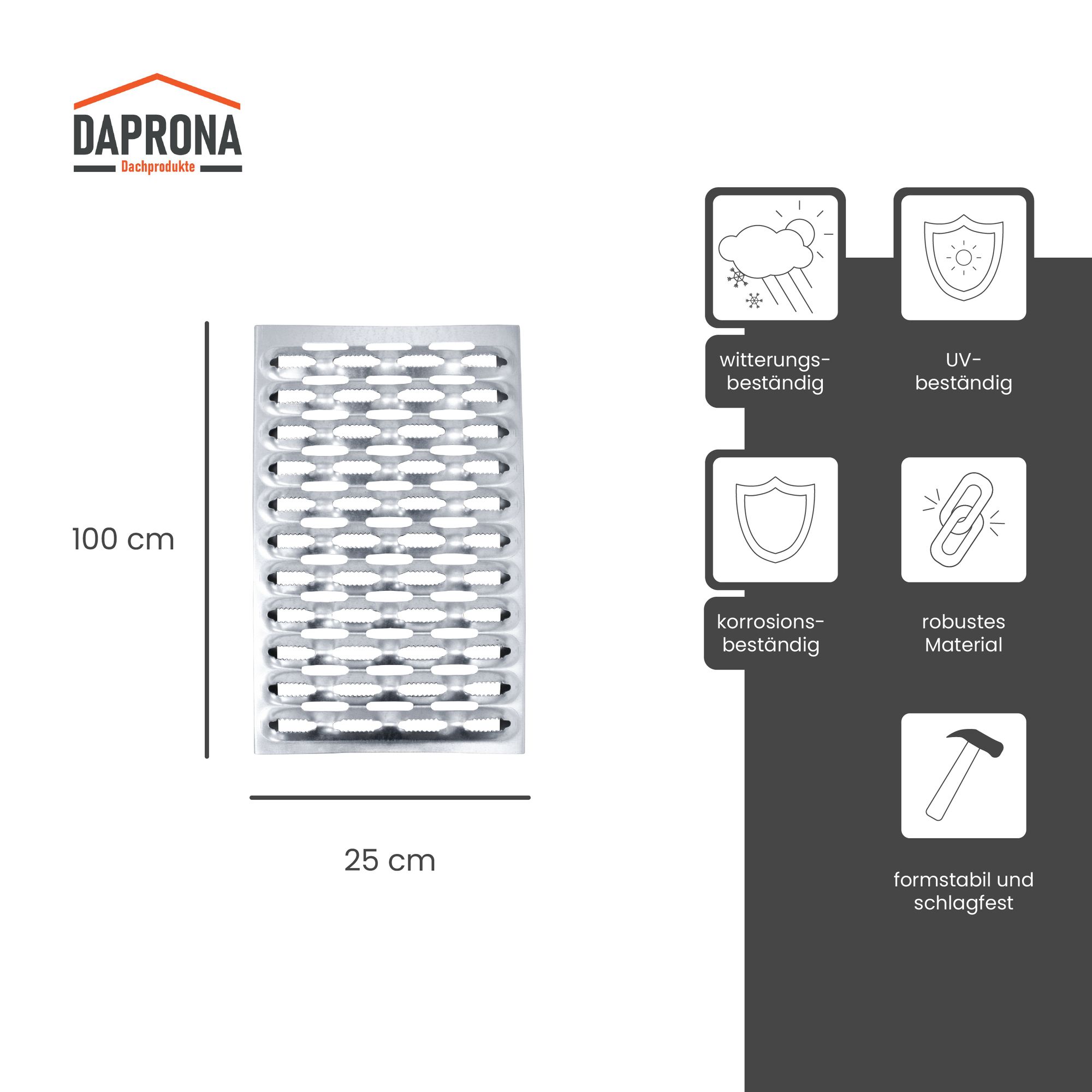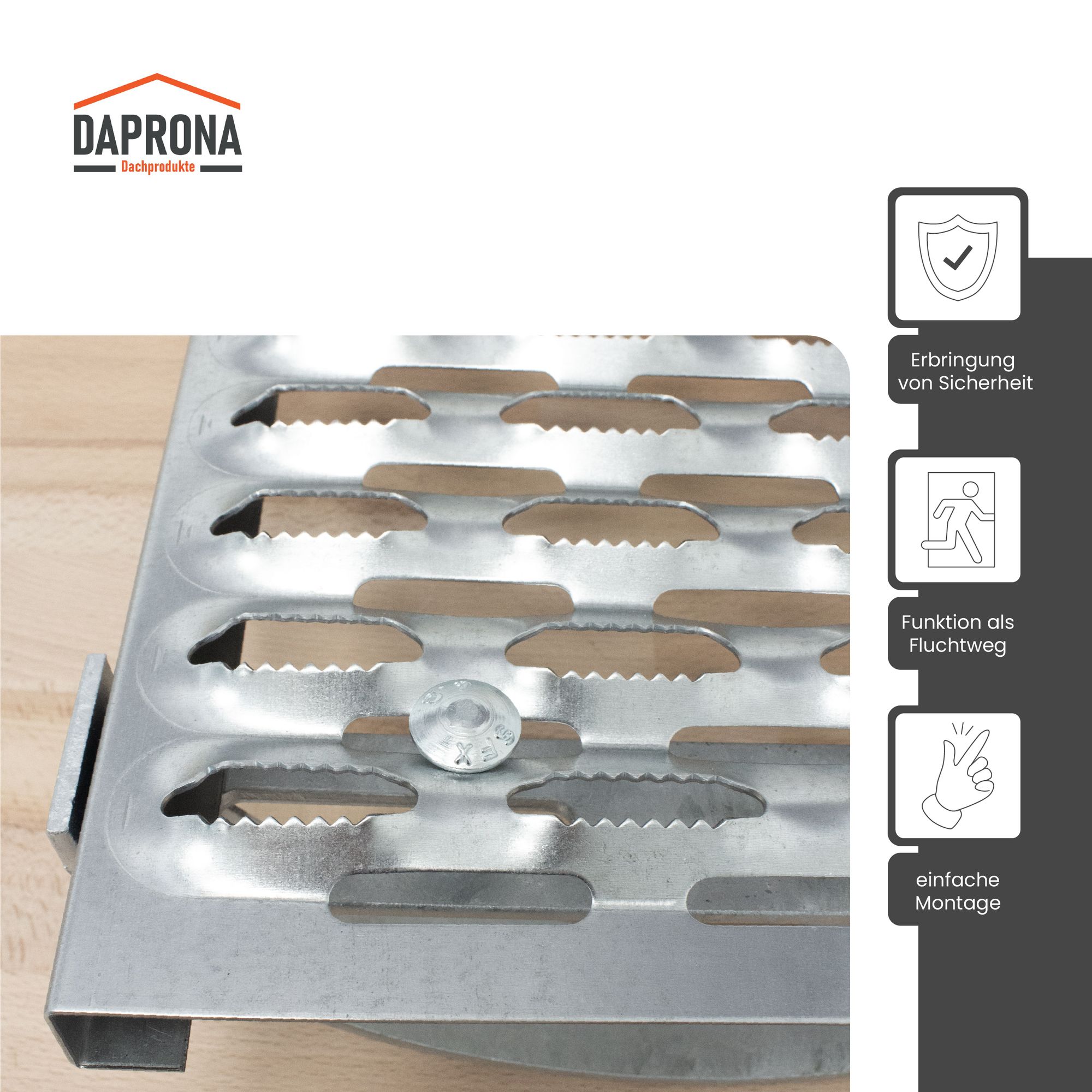 Arbeiten am Hausdach sind mit dem Laufrost von Daprona unkompliziert und mit einem hohen Maß an Sicherheit verbunden. Der Laufrost gewährleistet eine freie Bewegung auf dem Dach, kann zudem als Fluchtweg dienen und schafft einen optimalen Kamin-Zugang für Schornsteinfeger. Er ist aus verzinktem Stahl gefertigt und hat eine zusätzliche rutschfeste Perforation, welche sicheres Arbeiten auf dem Dach garantiert.